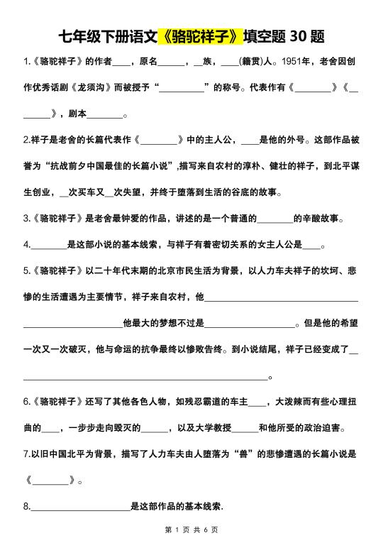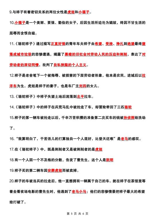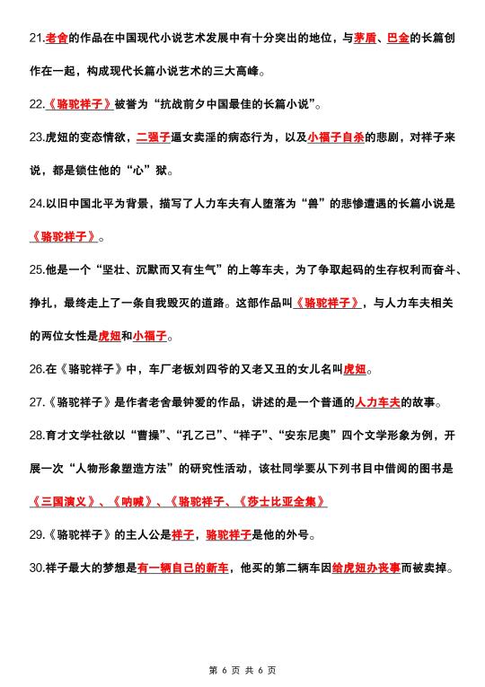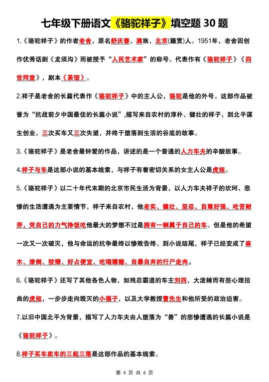 初一 初一语文 七年级下册 七年级下册语文 七下语文 骆驼祥子 名著阅读 知识点总结 家长收藏孩子受益 语文笔记