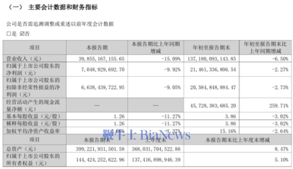 其中,前三季度营收为1371.80亿元,同比下降6.50%。净利润为214.61亿元,同比下降2.27%。