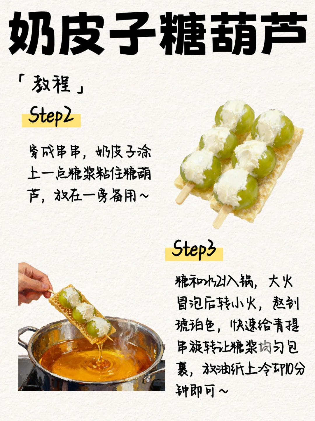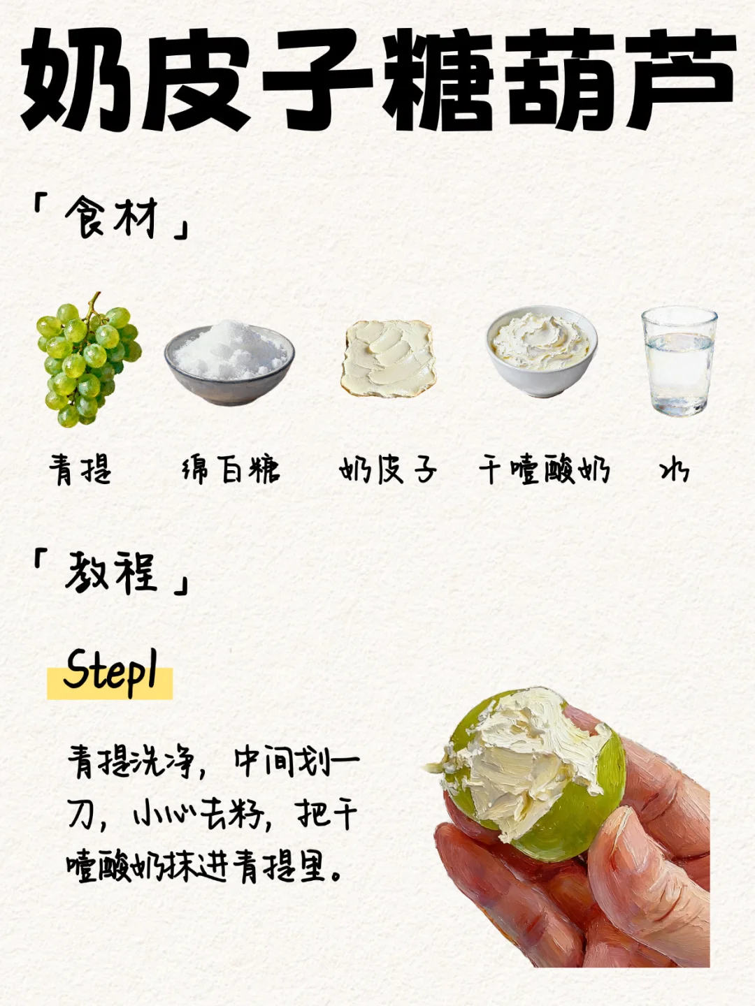 👋姐妹们!我终于对这款全网爆🔥的糖葫芦下手了!!没想到第一次做就成功了🥹这口感真的绝了!!比店里卖的还要好吃!而且材料超简单👏你们也可以去试试! ✅超详细教程: 1️⃣青提洗净,中间划一刀,小心去籽,把干噎酸奶抹进青提里。 2️⃣穿成串串,奶皮子涂上一点糖浆粘住糖葫芦,放在一旁备用~ 3️⃣糖和水2:1入锅,大火冒泡后转小火,熬到琥珀色,快速给青提串旋转让糖浆均匀包裹,放油纸上冷却10分钟即可~ 💗外面买不到咱就自己做!!姐妹们快收藏起来!!