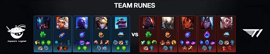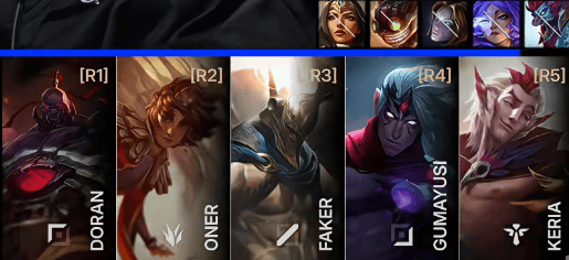 T1选用:Doran塞恩;Oner潘森;Faker岩雀;Gumayusi韦鲁斯;Keria洛