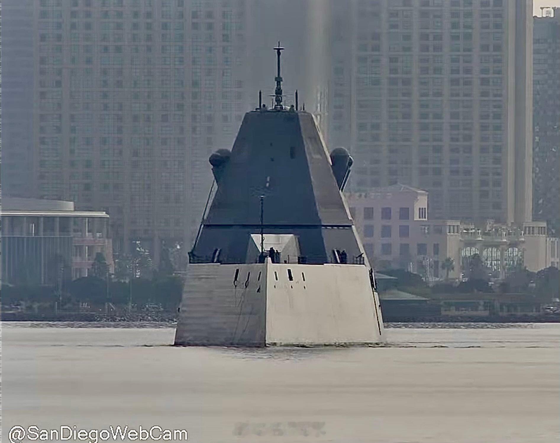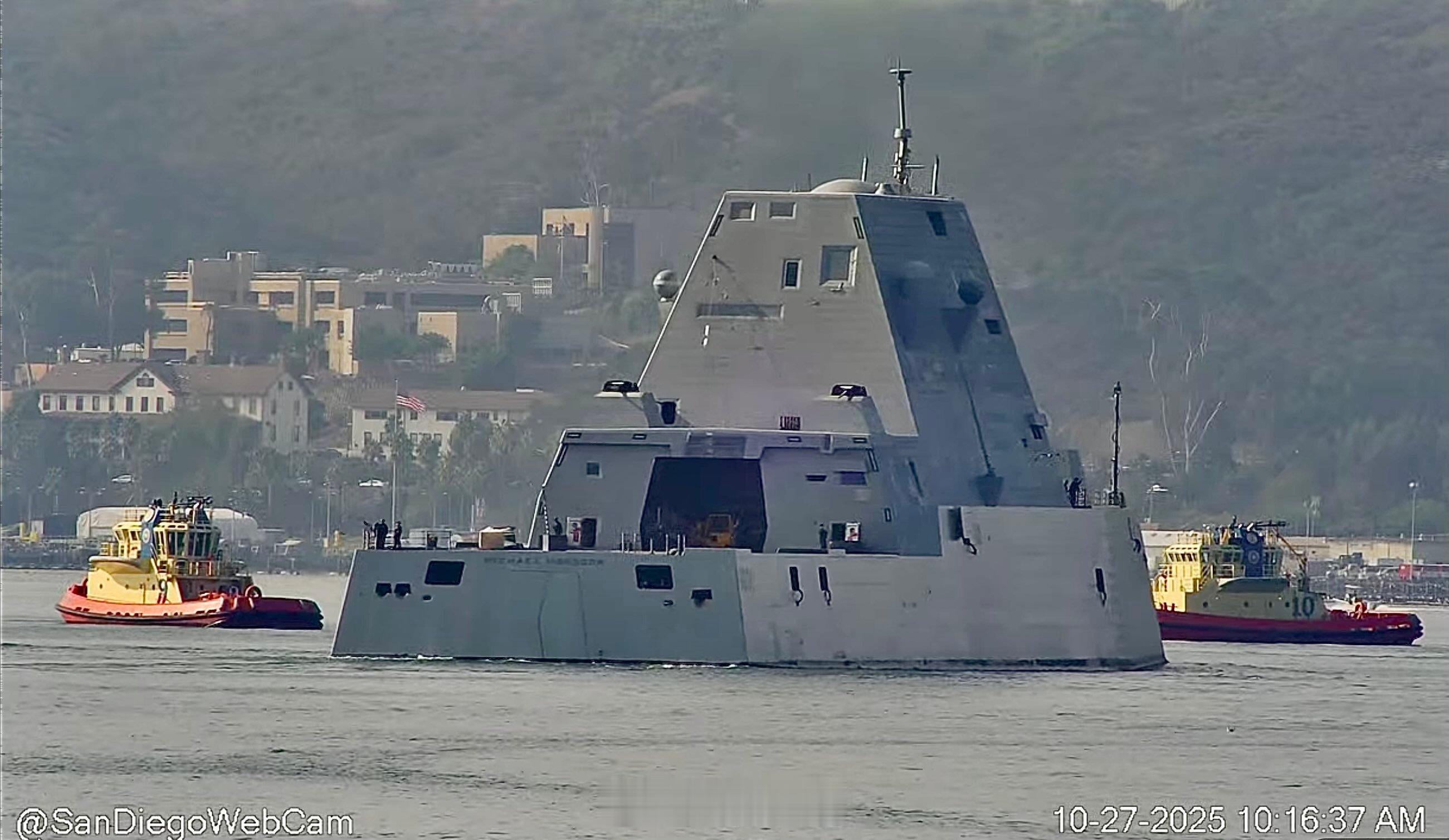 每天认识一件兵器烽火问鼎计划 2025 年 10 月 27 日,美国海军朱姆沃尔特级导弹驱逐舰“迈克尔·蒙索尔”号(DDG 1001)驶向圣地亚哥阿尔法码头。