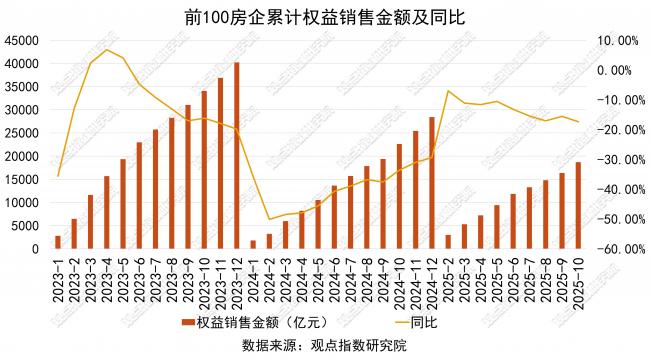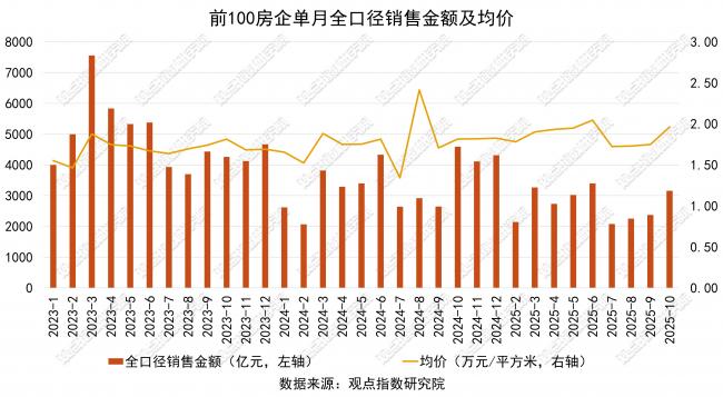 1-10月前100房企累计实现权益销售金额18686.8亿元,同比下降约17.36%,环比扩大1.8百分点。10月单月前100房企实现权益销售金额2327.65亿元,同比下降约28.19%,环比上升48.37%。前100房企1-10月累计全口径销售金额26559.31亿元,同比下降约17.80%。10月均价为1.96万元/平方米,同比上升8.14%。