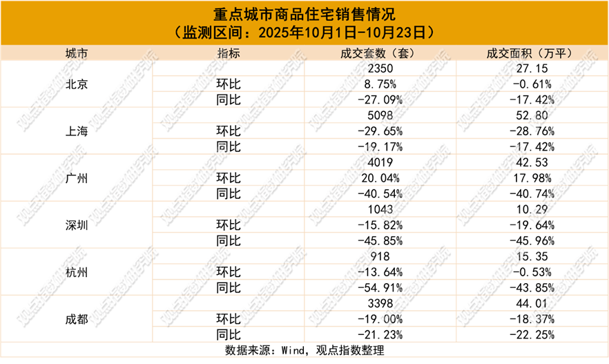 观点指数监测的6个重点城市中,10月前三周商品住宅成交量呈现政策刺激消退的共性特征。