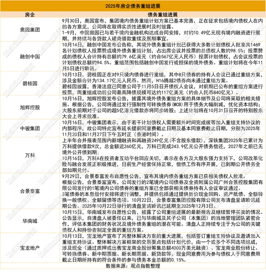 整体来看,房企债务重组已从“单一债务展期”向“股债结合+经营恢复”的综合方案演进,核心目标是通过债务结构优化与现金流改善,推动企业回归良性经营轨道。其他如奥园、旭辉、中骏等企业亦在推进境内债务展期、境外重组支持协议签署等进程,行业整体呈现“分化重组、稳中求进”的态势。