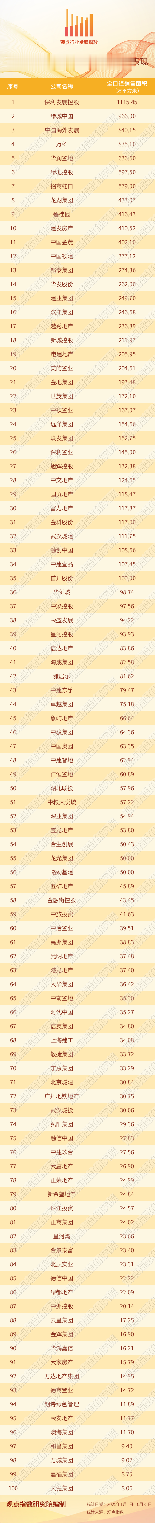 观点指数“2025年1-10月房地产企业销售表现”研究成果显示,保利发展、中海地产和华润置地占据权益销售金额的前三,分别录得1755亿元、1747.55亿元以及1152.4亿元。招商蛇口和建发房产紧随其后,为1045亿元、797.85亿元。权益销售金额超过500亿元的企业环比上月增加1家。