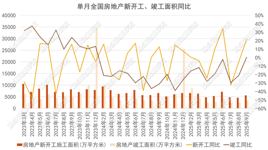 1-9月,房屋新开工面积45399万平方米,同比下降19.5%;跌幅持平。施工面积648580万平方米,同比下跌9.4%,跌幅扩大0.1个百分点;竣工面积31129万平方米,同比下跌15.3%,跌幅缩小1.7个百分点,新开工、施工、竣工指标都处在下跌阶段,但跌幅有所减缓。