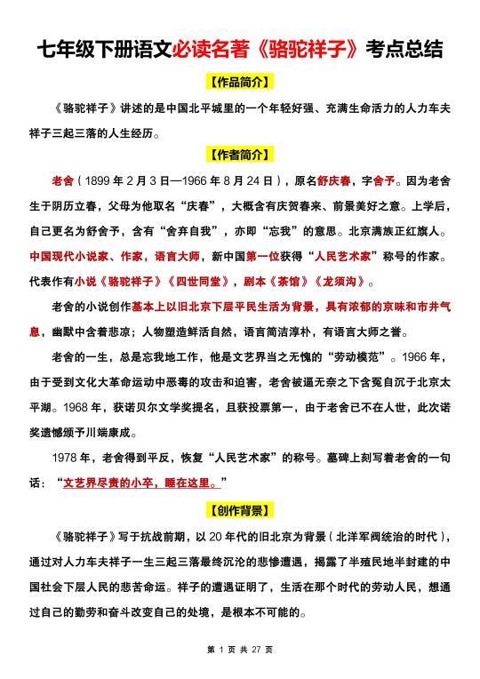 骆驼祥子 七年级下册 七年级下册语文 寒假预习 知识点总结 必考考点 家长收藏孩子受益 辣妈育儿经 七下语文 初一