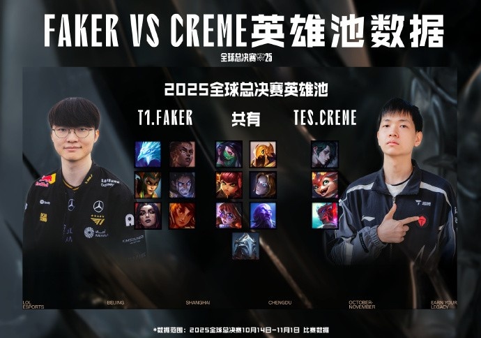 Faker和Creme2025全球总决赛英雄池中,重合的英雄有7个。