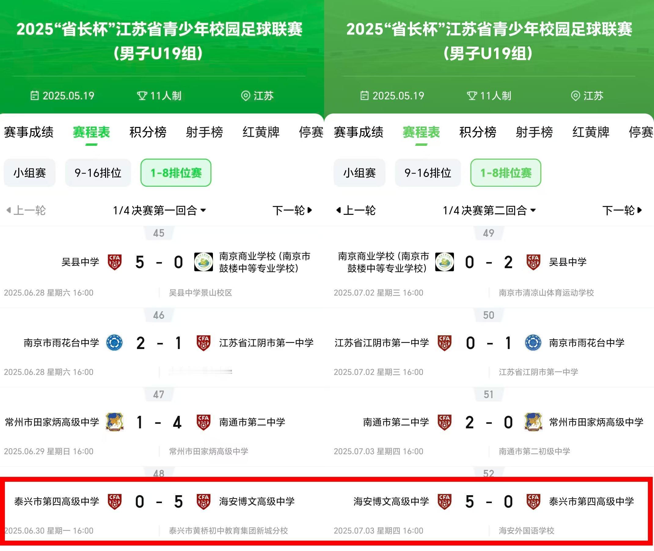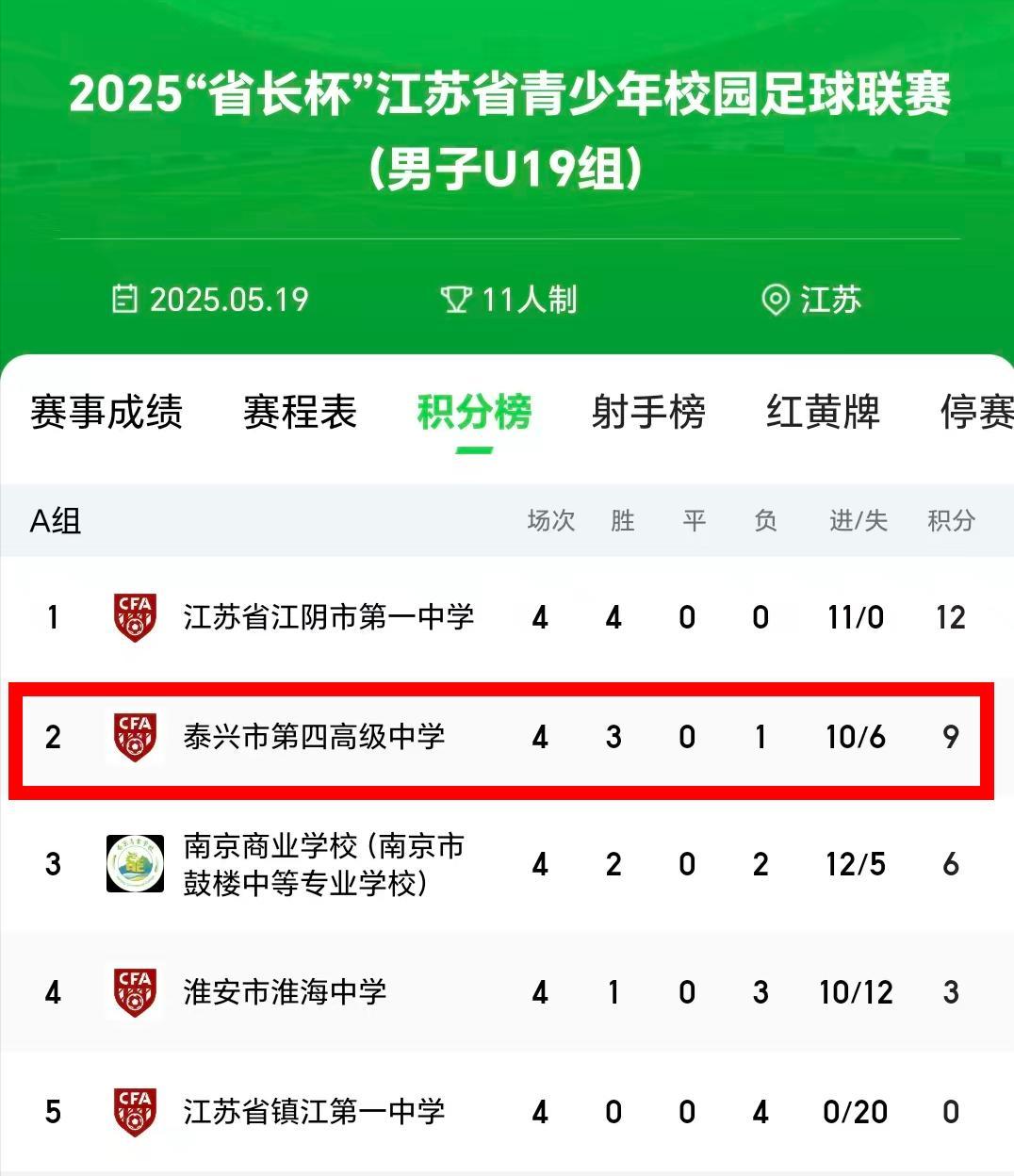 而省长杯U19组别,泰州四高出战分在A组,以3胜1平拿到小组第二出线。排位赛首轮,以两个0比5惨败海安博文高级中学。排位赛第二轮,分别以0比4,0比9惨败常州的田家炳高中。