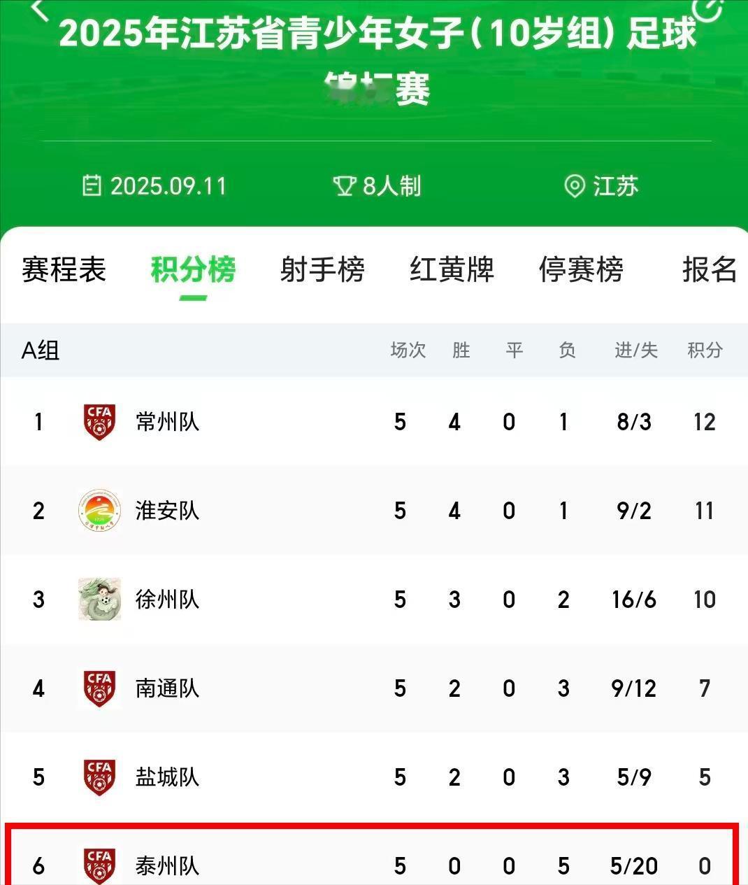 泰州U10女足,跟常州、淮安、徐州、南通、盐城分在一组,5场全败,进5球丢20球。