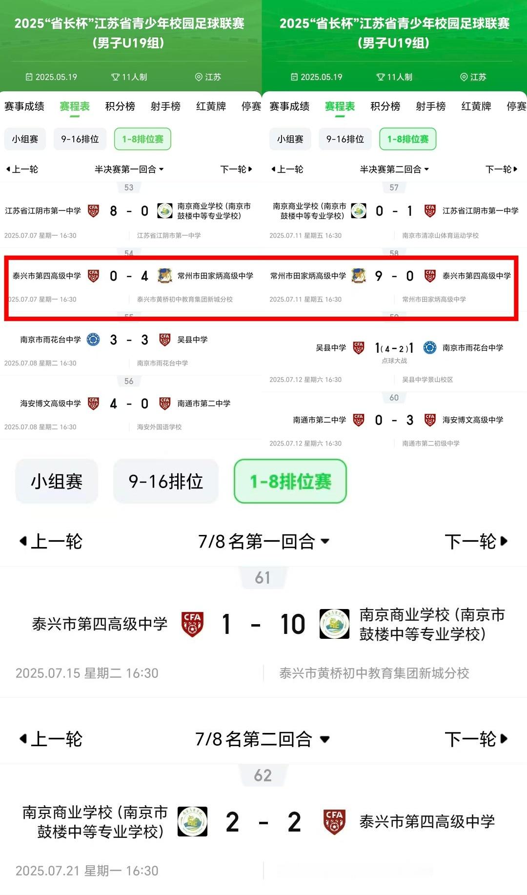 在最后的7到8名排位赛,第一回合1比10惨败南京商业学校,第二回合双方2比2战平,最终泰兴四高排在第8名。
