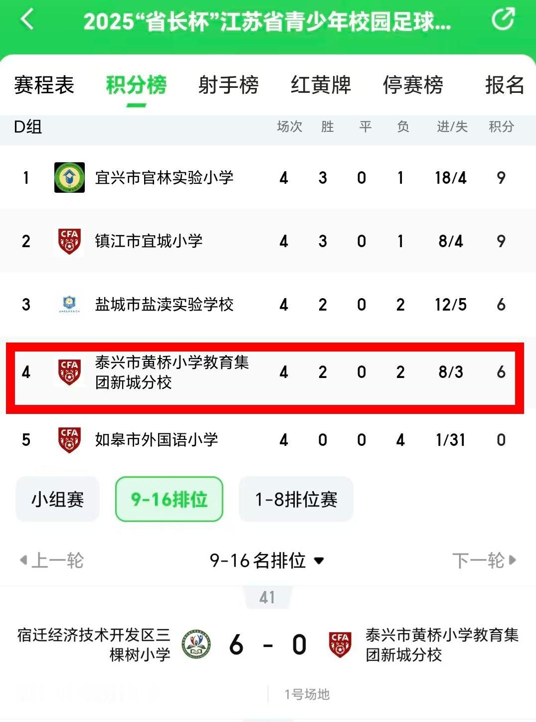 省长杯女子组比赛,泰州的学校没有参加小学甲组比赛,泰州市黄桥小学教育集团新城分校,参加了小组乙组。小组赛期间2胜2平,位居小组第4;9到16名排位赛,则是6球惨败。