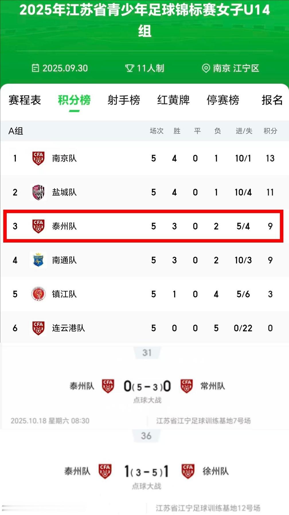 泰州U14女足,跟南京、盐城、泰州、南通、镇江、连云港一组,小组赛期间3胜2负排在小组第三!排位赛首轮点球大战击败常州,排位赛第二轮点球大战输给徐州,排在所有参赛球队的第6位!