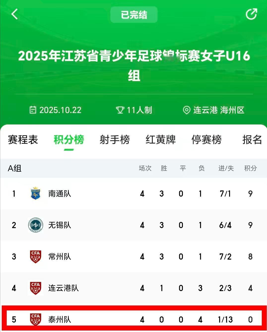 当然江苏省青少年足球锦标赛,不光有男子组比赛,还有女子组;泰州的女足小将们,交出的成绩单同样不怎么样。泰州U16女足,小组赛4场全败,进1球丢13球垫底。