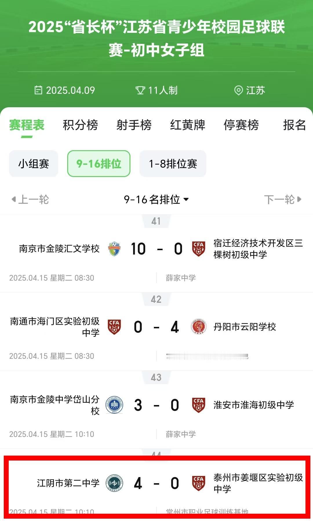 泰州的姜堰实验初中,则参加了省长杯初中女子组。小组赛期间1胜3负排在小组第四;9-16名排位赛,4球完败江阴二中。