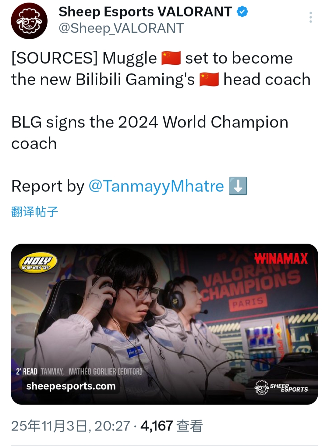 虎扑11月03日讯外媒爆料:前EDG教练Muggle将加入BLG担任主教练。