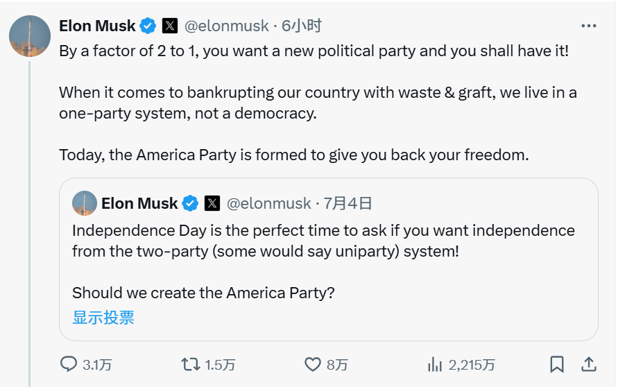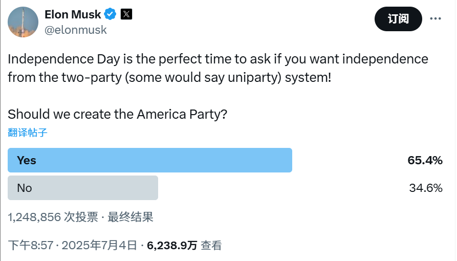 马斯克在这一天,正式发起了一项投票,议题简单粗暴:“是否应该成立‘美国党’(The America Party)?”
