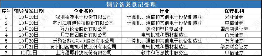 10月28日-11月3日,有7家公司境内(沪深两市)发行上市辅导备案登记获受理。