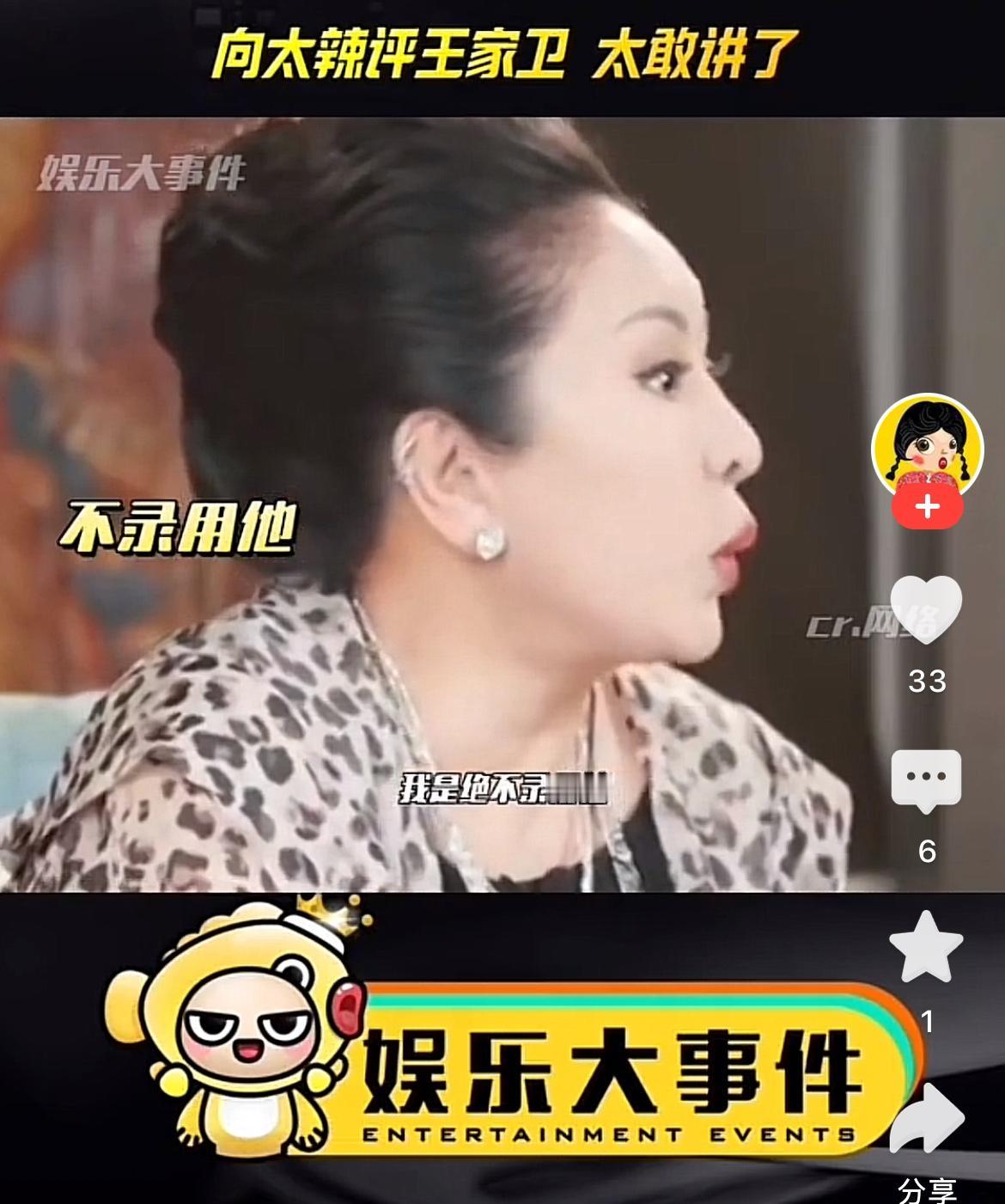 向太真是不鸣则已, 一鸣惊人! 本以为她也就是偶尔聊点圈里趣事,万万没想到这次直接开炮,说投资王家卫的老板基本都亏钱,还说自己绝不录用他。 《阿飞正传》花4000万港元,票房才975万,老板邓光荣公司差点破产。 《摆渡人》要10亿回本,结果只有5亿,老板的钱又不是大风刮来的,哪经得起这么亏。 王家卫拍电影没完整剧本,《花样年华》拍15个月,《2046》耗5年,反复重拍,演员档期被占,剧组跟着受累,把工作人员当廉价劳动力。 导演有艺术追求是好事,但总让老板亏钱、剧组受苦,一点责任心都没有!