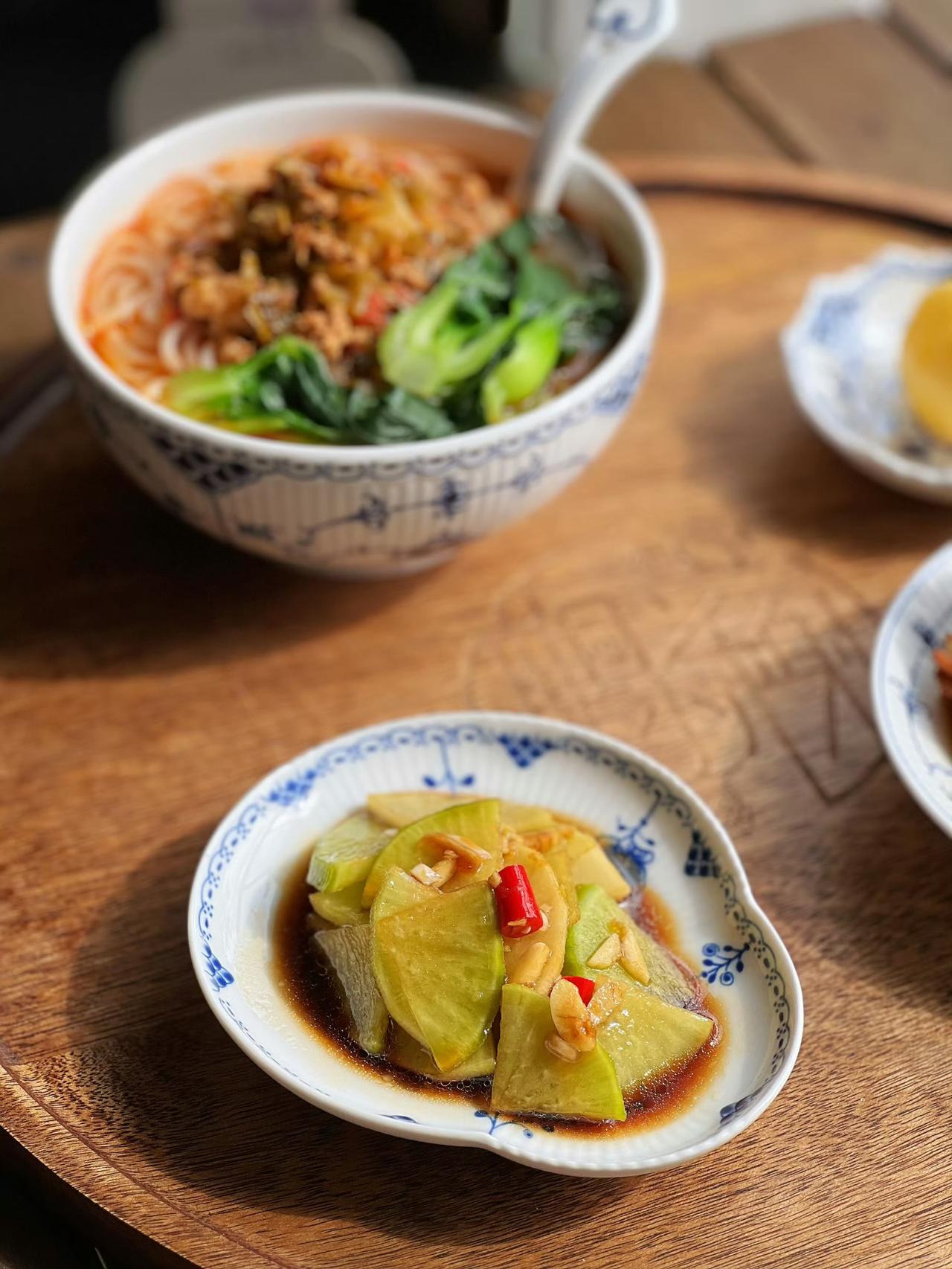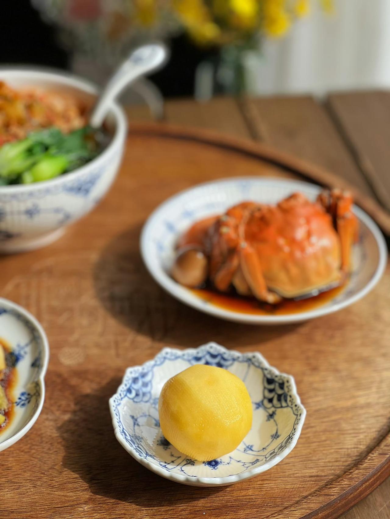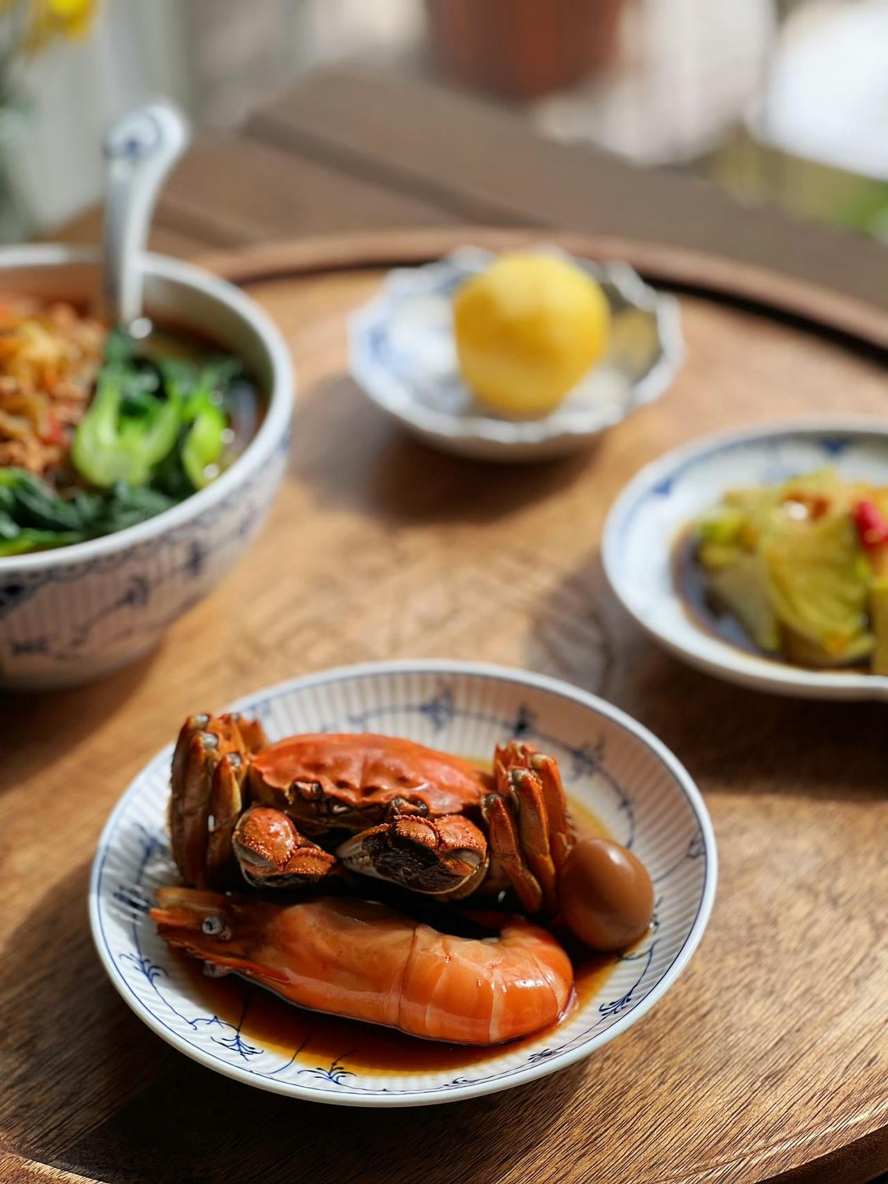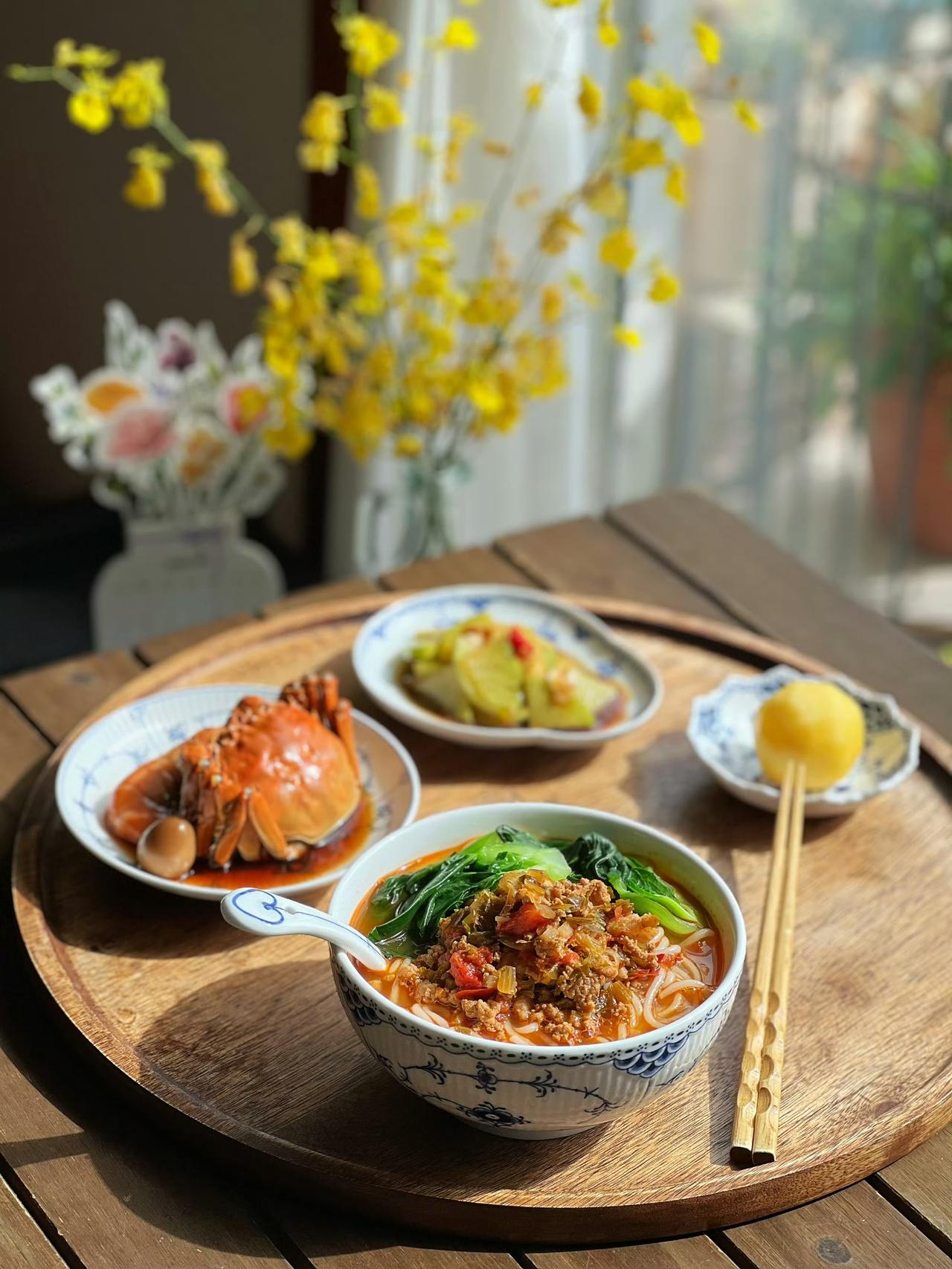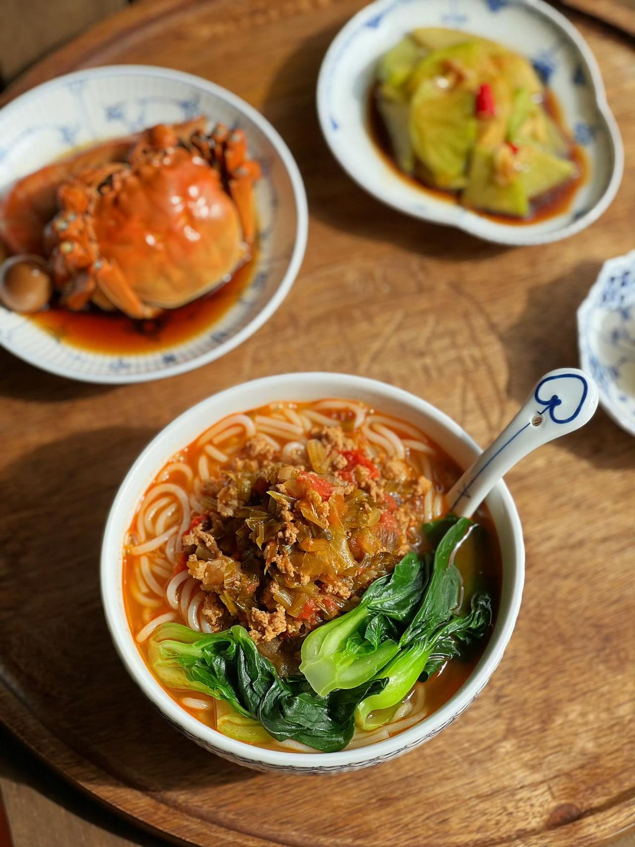 午餐🍱 番茄雪菜肉末米线: 锅里热油下姜片、蒜片、葱白煸香,倒入肉末翻炒至断生变色,淋上料酒翻炒,加一勺郫县豆瓣酱炒香后加入雪菜翻炒片刻,再加番茄丁煮一会,加生抽、蚝油、糖调味。米线提前煮熟过凉水沥干备用,锅里放一大勺炒好的番茄雪菜肉末酱,加开水煮沸,放入鸡毛菜煮软,再放入米线撒上葱花。 熟醉蟹、醉虾、醉鹌鹑蛋: 螃蟹肚子朝上放在蒸盘里,每个螃蟹上放一片姜,蒸盘底下放个小盘,里面倒点料酒,蒸箱120度蒸15分钟左右,闷3分钟,取出晾凉;鹌鹑蛋煮熟去壳晾凉备用;虾加葱姜料酒焯熟捞出放凉; 另取一锅,我用的4.1L的康宁锅,可以煮,可以直接放冰箱冷藏,比较省事;加1200克水,250克冰糖、500克生抽,20克香醋,4克盐,再加入八角,桂皮,香叶,花椒,干红辣椒,生姜,中药乌梅,新会陈皮,煮沸。晾凉后再加入500克花雕酒,放入晾凉的螃蟹、虾和鹌鹑蛋,密封冷藏24小时后食用。 这个量的料汁大约可以放八个三两左右的母蟹、一斤大头虾、一斤鹌鹑蛋,供参考 腌萝卜: 青萝卜去皮切片,加盐和糖抓匀腌制30分钟;腌制的时候准备料汁,姜、蒜、小米辣、花椒放碗里,淋上热油,加生抽、蚝油、陈醋、白糖拌匀,放入挤干水分的萝卜拌匀再腌制30分钟就可以了。