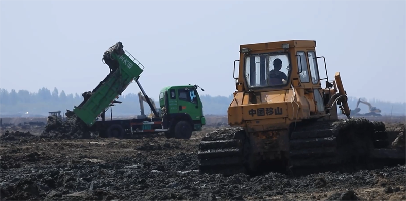 七里海潟湖湿地生态减灾修复过程中,工程车进行拆除养殖围堰作业。(摄于2022年9月)河北省地质矿产勘查开发局第八地质大队供图