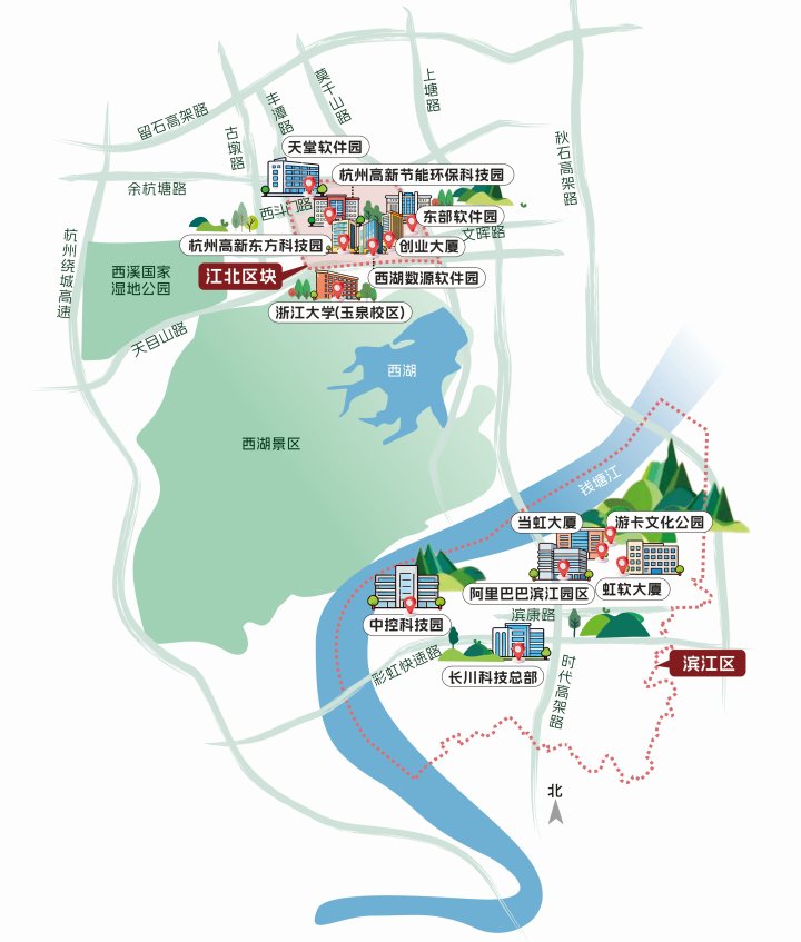 今年1-8月,高新兴创联科技、高瓴医疗科技、海速芯(杭州)科技、游卡网络等257家企业从江北迁至江南。游卡网络钱塘江南岸的总部,位于滨江互联网小镇,一个占地面积约26亩的游卡文化公园。