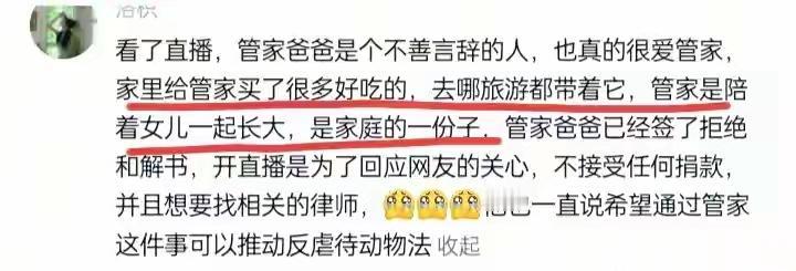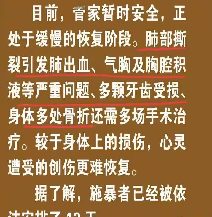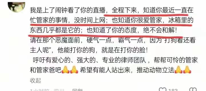 “必须让他付出代价!”杭州青山湖马犬遭男子酒瓶砖块疯狂殴打一事持续引发全网震怒。经过六天抢救,受伤马犬“管家”终于脱离生命危险,主人首次直播明确表态:关打赏、拒捐款、绝不和解! 10月29日事发当天,管家遭男子用十几个酒瓶砸头、板砖连续击打,导致全身多处骨折,肺部撕裂引发气胸和胸腔积液,生命一度垂危。 在11月4日的直播中,主人透露管家虽度过危险期,但肺部损伤严重,部分血管已无法显影,牙齿碎裂,今后再也不能像从前那样奔跑玩耍。最让人心疼的是,这只乖巧的马犬即便遭受如此虐待,也始终没有攻击施暴者。 面对网友关心的和解问题,主人斩钉截铁表示“没有任何谈和解的余地”,目前正在寻找专业律师,希望通过此案推动动物保护立法。对于事发时“将狗交给情侣照看”的传言,他坦言不愿多作解释,只想专心照顾爱犬。 如今管家见到主人仍会委屈落泪,需要长时间趴在他腿上才能安睡。主人说,这只看着女儿长大的马犬是家人,他一定要维权到底,“给家人一个交代”。 对于这件事情,大家有什么看法?