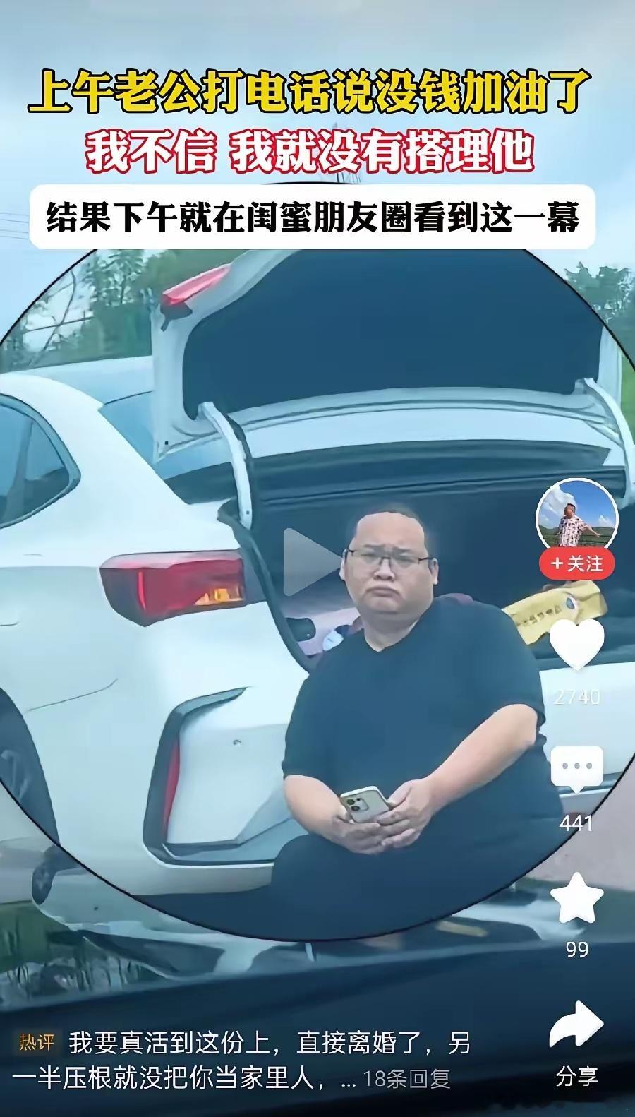 据说是大哥没钱加油了,老婆不相信也没理他,他就杵在路边一脸委屈,还挺萌萌哒