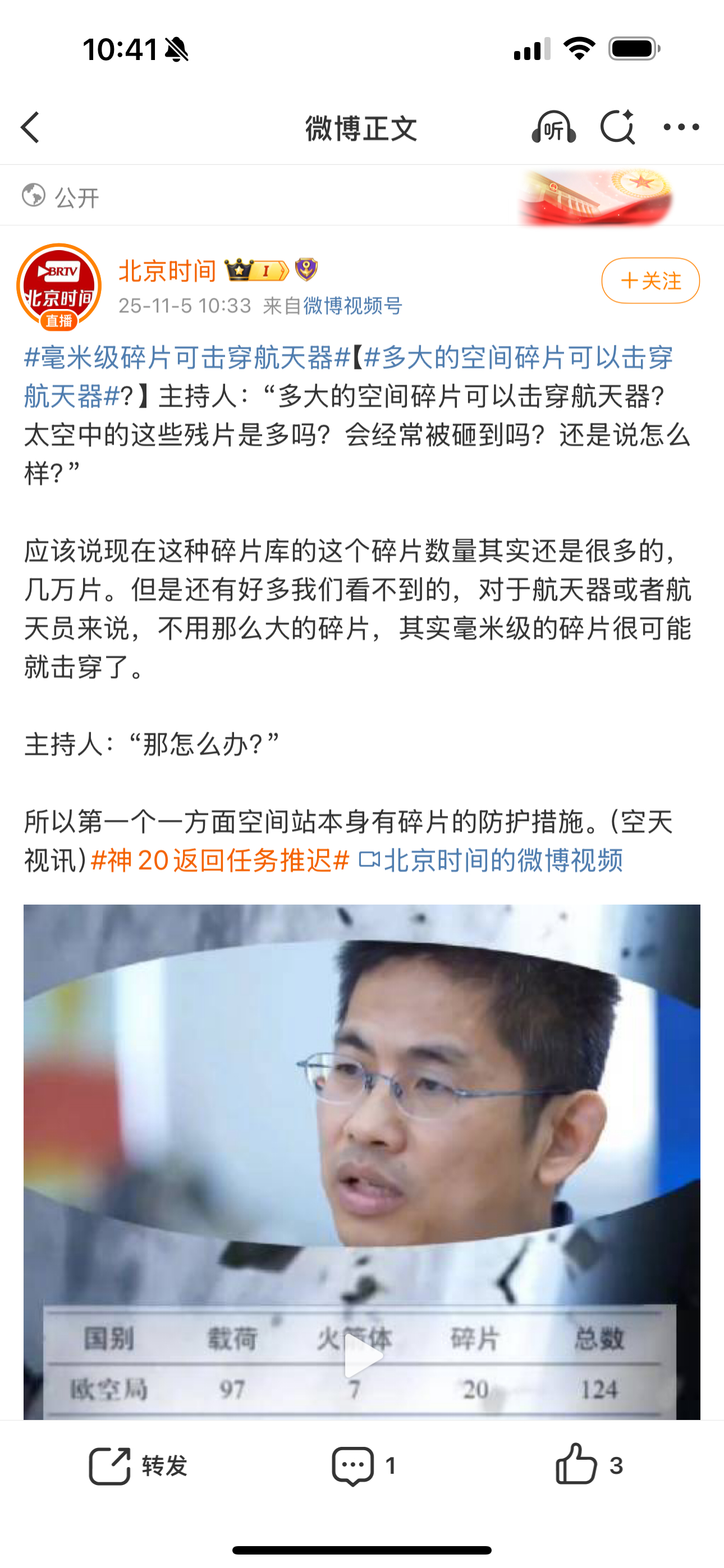 #神20返回任务推迟#1.航天器遭遇太空碎片撞击很危险,专家说法,毫米的碎片都可能会击穿航天器;2.进行影响分析和风险评估,决定推迟返回任务,这是一个负责任的决定;3.网友的关注,转发与祝福,还有期待平安,反映了大家对航天员的关心;4.不过也没有必要过于担心,航天器是发一备一的,有神舟21号可以返回,还有神舟22号可以备发,这都是周全的安全考虑![祈祷][祈祷][祈祷][祈祷]#热点解读#
