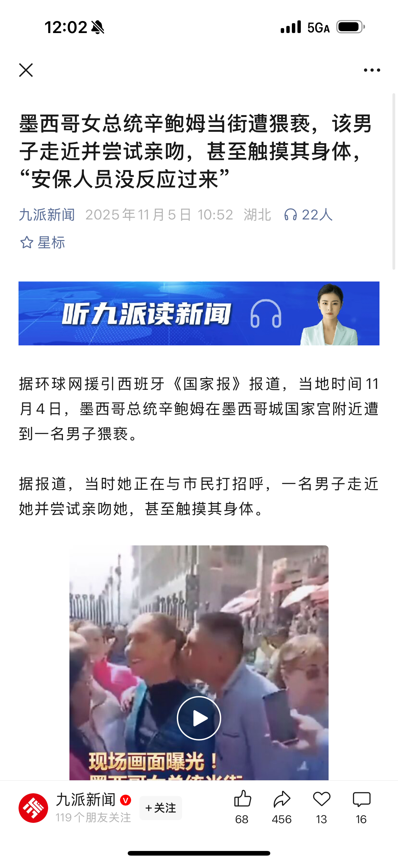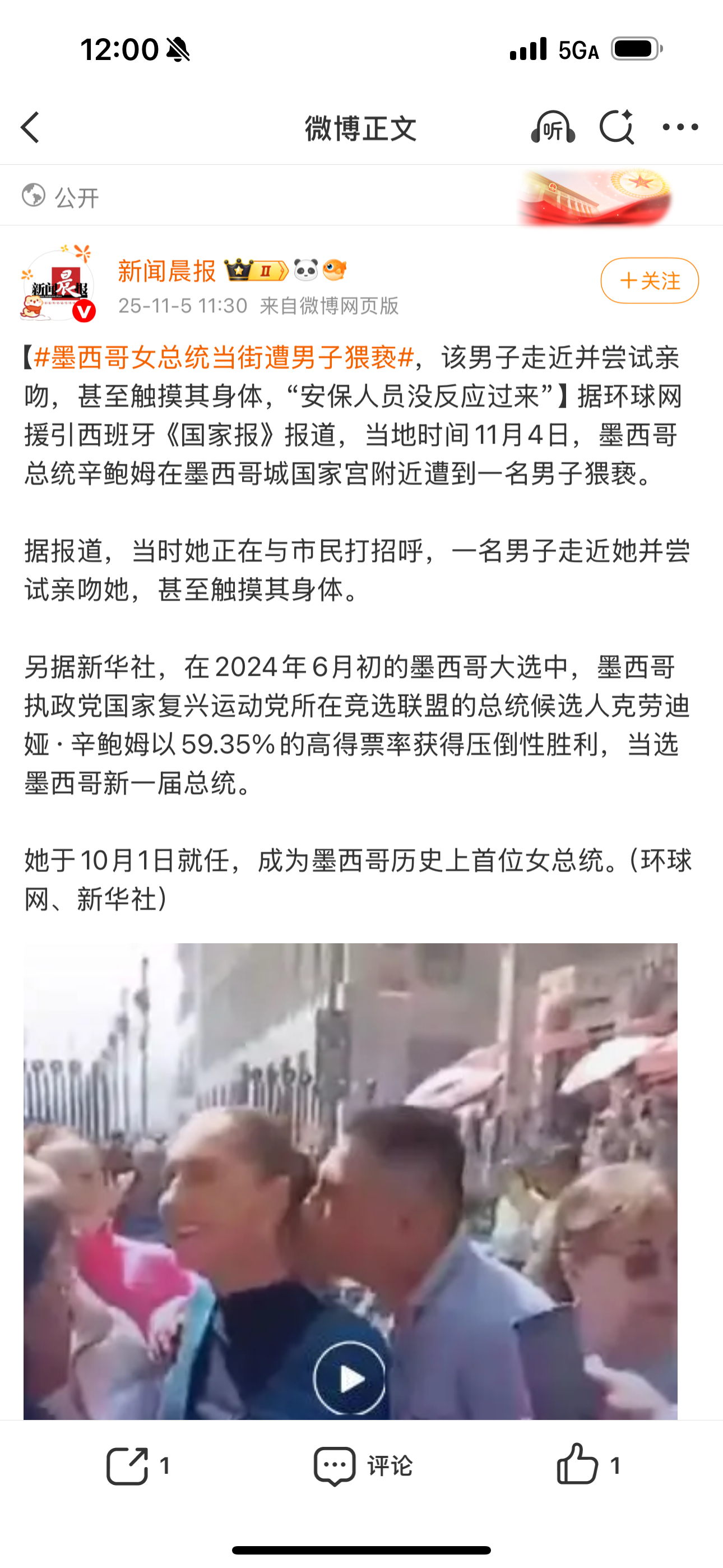 #墨西哥女总统当街遭男子猥亵#太不可思议了,国家元首尚且如此,其他女性更是可想而知!国家元首的安保太菜了,网友说,连小区的保安都不如!确实国家元首的安保措施,现在看草台班子都不如!当然国家元首与民众的这种亲密互动是点赞的,不过也需要注意,毕竟如网友所说,亲民不能被民亲[允悲]#热点解读#