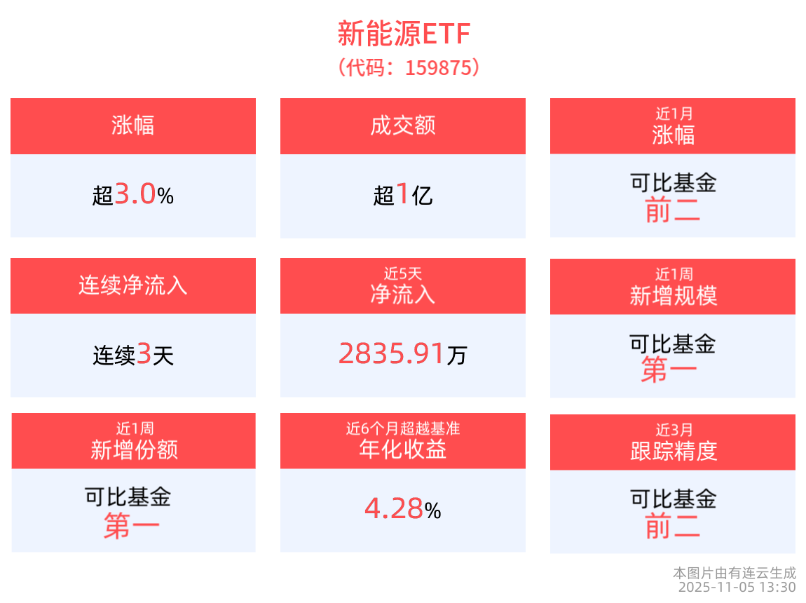 截至2025年11月5日13:30,中证新能源指数强势上涨3.26%,成分股阿特斯上涨17.37%,特变电工上涨9.99%,天合光能上涨8.74%,亿纬锂能,湖南裕能等个股跟涨。新能源ETF(159875)上涨3.08%。拉长时间看,截至2025年11月4日,新能源ETF近1周累计上涨4.44%。