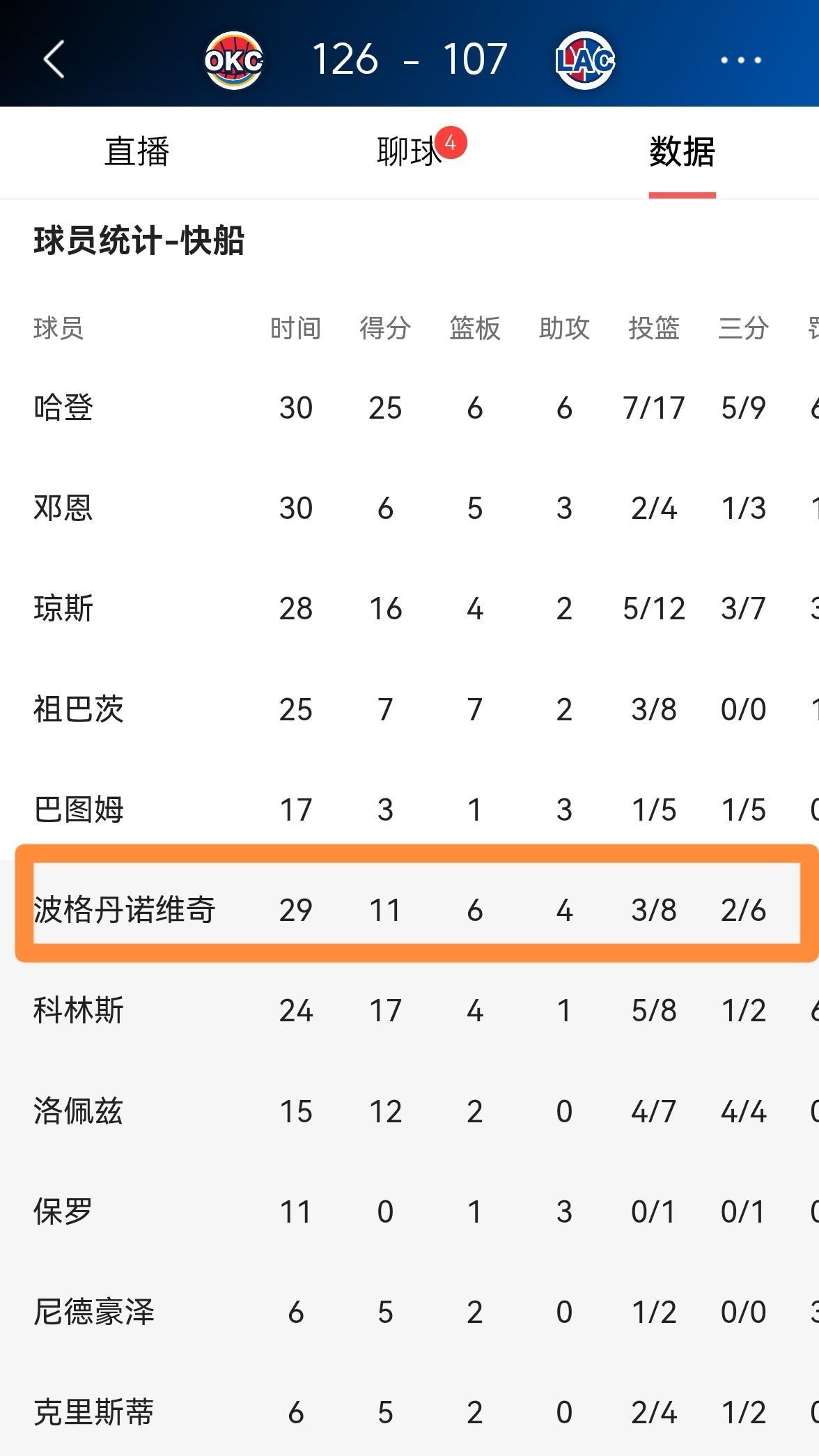 快船神射手博格丹诺维奇终于争气了一回!虽然今天快船在主场以107:126输给了强大的雷霆,但是博格丹诺维奇终于复苏了。 全场比赛下来,博格丹诺维奇替补出战29分钟,投篮8中3,其中三分球6中2、罚球4中3得到11分6篮板4助攻2抢断。 随着博格丹诺维奇的状态逐渐好转,我相信快船即将迎来一波连胜。