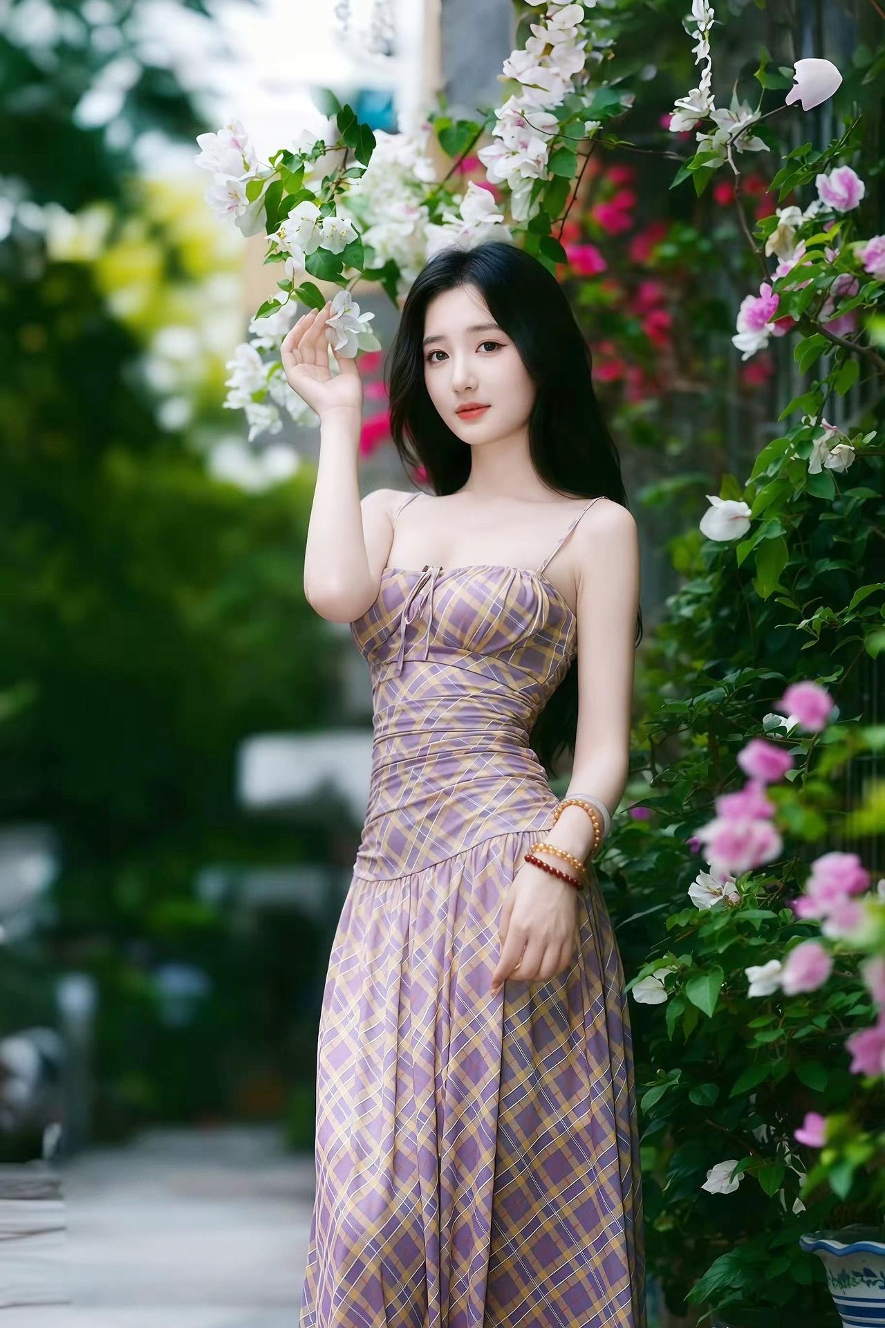 《格纹裙的夏意》 原创诗词 原创看图片配诗 格纹裙揉碎了紫与黄的光斑 在花枝与风的间隙 她是行走的诗行 指尖碰落的花 吻过发梢的香 腕间的珠串轻响 和着裙摆的轻晃 一朵粉玫瑰在掌心 把夏日的浪漫 酿成了眸里的光