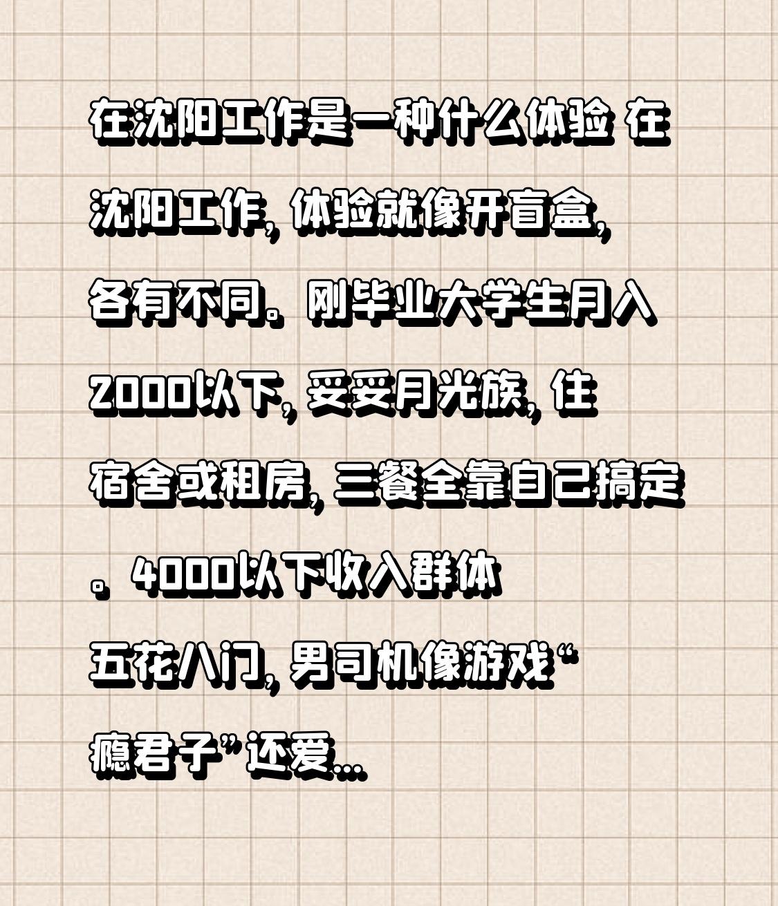 在沈阳工作是一种什么体验 在沈阳工作,体验就像开盲盒,各有不同。刚毕业大学生月入2000以下,妥妥月光族,住宿舍或租房,三餐全靠自己搞定。4000以下收入群体五花八门,男司机像游戏“瘾君子”还爱抽烟,民企人员怕花钱不愿考证。6000以下是大众水平,娱乐爱拼团,生活有乐但上进心像蜗牛。8000以下的市公务员等择偶有要求,一心向往诗和远方。 但也有亮点,京东物流张颖大姐打拼15年有退休金,能出门旅游潇洒。沈阳就业有挑战,也能带来安稳与满足。