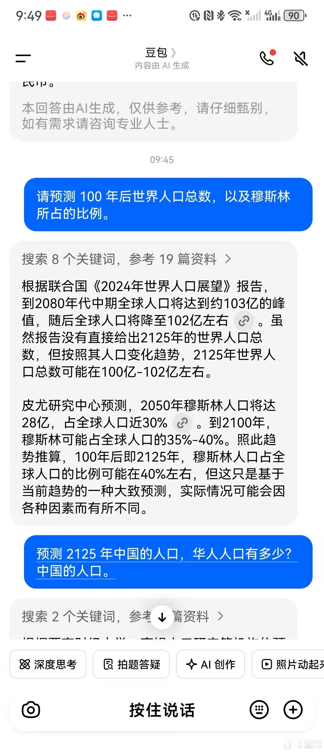 如果现有的趋势不变,100年后(2125年)世界人口总数:根据联合国《2024年世界人口展望》报告趋势推算,可能在100亿-102亿左右。100年后(2125年)穆斯林人口占比:基于皮尤研究中心趋势推算,可能在40%左右,实际情况或因多种因素有所不同。