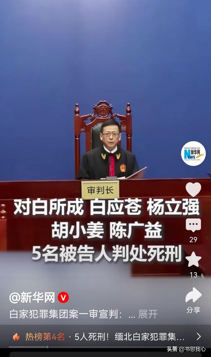 两年前,缅北白家可能策划过一次“金蝉脱壳”,只是,“天网恢恢,疏而不漏”,他和两个儿子终究是被抓到案,审判了。 今天看到凤凰之前的报道《缅北战事:以打击电诈为由》,2023年, “11月17日,白所成一家为自保拒绝回中国自首,在当地乘坐直升机逃亡时被果敢同盟军击中,直升机爆炸坠毁。白所成二儿子白应苍、女儿白应兰、女婿曹强力全部确认死亡,但尚不确定白所成是否在直升机上。” 如果相信这个消息,那么就会认为“ 白所成二儿子白应苍、女儿白应兰、女婿曹强力”已经被消灭。实际上,应该是2024年1月,白所成、白应苍都被抓捕移交给中国警方。 在前几天的宣判中,白所成和二儿子白应苍也都是被判了死刑。大儿子白应能则是另案处理。 但是,白应兰、曹强力都逃了。白所成的另外几个女儿白应香、白应萍等人应该都是在逃! 也有可能,白家策划的“金蝉脱壳”也还是给她们争取了时间,这几个恶魔才出逃成功。 希望国家能早日把她们抓捕归案!