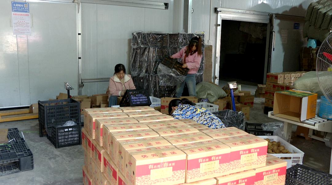 与直播间抢单热潮同步,后端供应链也高效运转。在兴山古夫镇的莱德农业仓储基地,成箱的三峡苹果柿整齐码放,工人们正有序进行备货、耗材整理,全力备战即将到来的销售高峰。