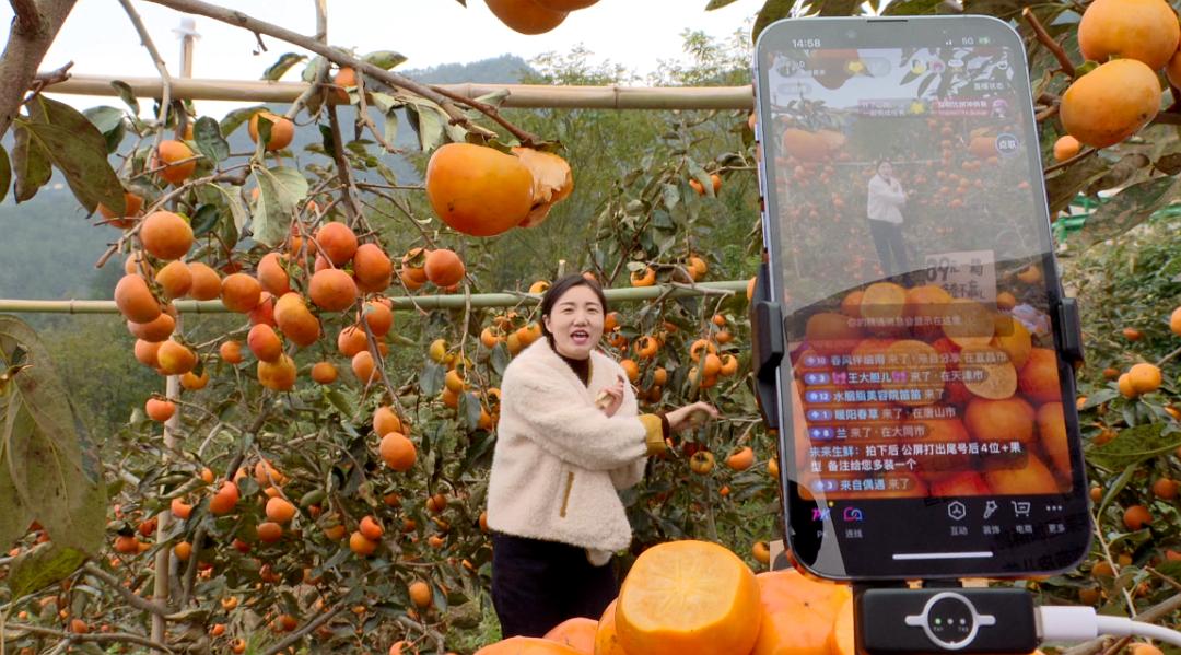 近日,记者在兴山县峡口镇岩上茶居柿子基地看到,主播团队正穿行于果实累累的柿林间,通过直播平台向全国网友推介当地特产——三峡苹果柿。直播过程中,主播手持金黄饱满的果实,一边细致讲解产品特点,一边与线上观众热情互动。现场试吃环节,更将直播气氛推向高潮,鲜脆多汁的柿肉引得评论区点赞刷屏,许多网友在线下单,争相认领这份来自兴山的秋日甜蜜。