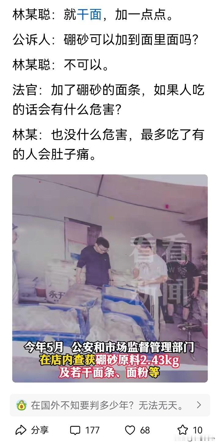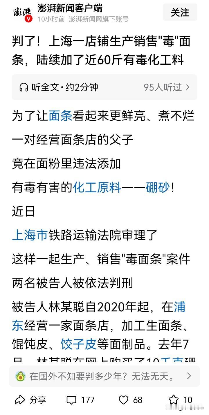 上海浦东一对林姓父子,往面条里加了接近30公斤的“毒物”硼砂,卖给消费者,这个事情,你怎么看? 综合光明网和澎湃的报道,2020年到2024年6月之间,四年时间,就算这个林某聪还是正常合规经营吧。是什么鼓励他在2024年7月,开始往面条里加有毒的化工原料硼砂? 为了面条“久煮不烂、外观鲜亮”,生意也就更好一点,于是往面条里面加有毒的化工原料硼砂!这样的行业资讯,估计大家都早就知道了,林某聪知道也不奇怪…… 那么,他想过假如因此被抓到的情形吗,想到后果吗?他就在这个食品行业,估计也是知道的。 但是,为了赚多一点钱(也不知道他赚多了多少),他还是义无反顾地往面条里加硼砂了。他和他的父亲,在2024年7月到2025年5月期间,合计买了30公斤硼砂,除了被查获时还有2.43公斤,那些硼砂肯定都用到面条里了。 他知道假如被抓到,会被惩戒,但后果一般般,因为别人被抓到,判罚也很普通…… 果然,林某聪是一年(缓刑),据说缓刑相当于就不用坐牢吧,其父7个月,两个合计被处罚1.5万元…… 果然是重罚重判! 我很不明白,这还是在上海浦东,引领全国,光明网和澎湃对此案的报道出来后,不知道有多少起坏心思的人要摩拳擦掌,为了多赚几块钱,要往食品里面添加硼砂了吧……