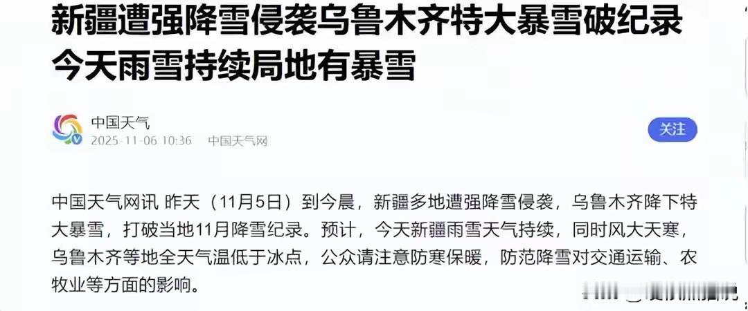 乌鲁木齐暴雪破纪录!新疆能重见汉唐绿洲盛景吗? 11月5日午后到6日清晨,乌鲁木齐的雪下得毫无章法,17小时里纯雪量堆到31毫米,积雪深达21厘米,直接刷新了当地11月的特大暴雪纪录。机场临时管制了进出港航班,连熟悉路况的老司机都不敢轻易上路。 这场暴雪的成因。在于地理与气候的交织里。来自黑海、里海的水汽被西风环流带至天山北麓,与南下的冷空气在此碰撞。 天山的地形像一道天然屏障,迫使气流抬升冷却,让降水系统在原地持续堆积,雪便下得格外猛烈。这并非偶然,近年新疆极端雨雪频次明显增加,背后正是“西北暖湿化”的大趋势在发力。 过去六十余年,新疆的升温速度远超全国平均水平,每10年气温上升0.316℃。降水的增长更直观,如今年均降水量比上世纪60年代多了30%,部分区域每10年能多增9毫米。 艾西曼地区的植被覆盖率,因此翻了10倍,干涸半世纪的青土湖重现波光,塔克拉玛干沙漠边缘曾浮现临时湖泊,塔里木河下游胡杨林新生面积达12万亩。 这些变化,总能让人想起新疆的汉唐往事。那时的塔里木河“汪洋东逝,两岸旷邈弥望”,孔雀河水源充沛,孕育出连片绿洲,楼兰、龟兹等城邦国沿丝绸之路崛起,成为商旅往来的枢纽。 不过,如今年均降水量最多才260毫米,仅为汉唐湿润区域的一半多,而蒸发量却高达1500至2200毫米。 沙漠里的临时湖泊,与当年塔里木河滋养的稳定绿洲不同,多是洪水形成的积水,很快便会蒸发殆尽。更关键的是,如今降水增加主要集中在北疆,南疆不少区域仍延续着干旱旧貌,难以形成大范围连续绿洲。 但气候数据显示,过去三十年塔里木盆地降雨年均增幅2.4%,蒸发量增幅仅1.8%,水汽的累积正在缓慢改变局部生态。 或许数十年后,南疆部分区域能重现“水足草丰”的景象,塔里木河下游胡杨林连成大片,绿洲随水源扩展,慢慢接近历史上的宜居状态。