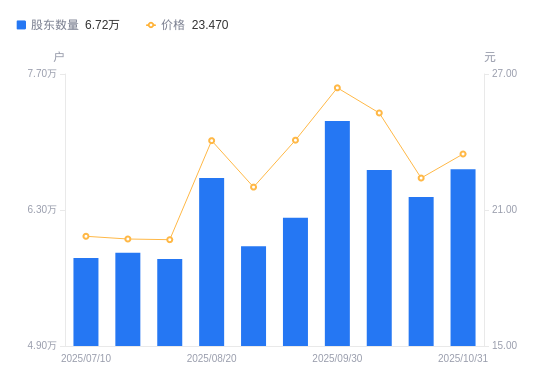 日期A股户数(户)流通A股户均持股数(股)户均持股市值(万元)2025-10-31672048390.1319.692025-10-20643518762.1119.642025-10-10671158401.2621.242025-09-30721557814.4320.622025-09-19622039064.6821.832025-09-10592679513.7320.942025-08-20662928505.5520.462025-07-31579509729.9419.162025-07-18585929623.3318.982025-07-10580489713.5219.27