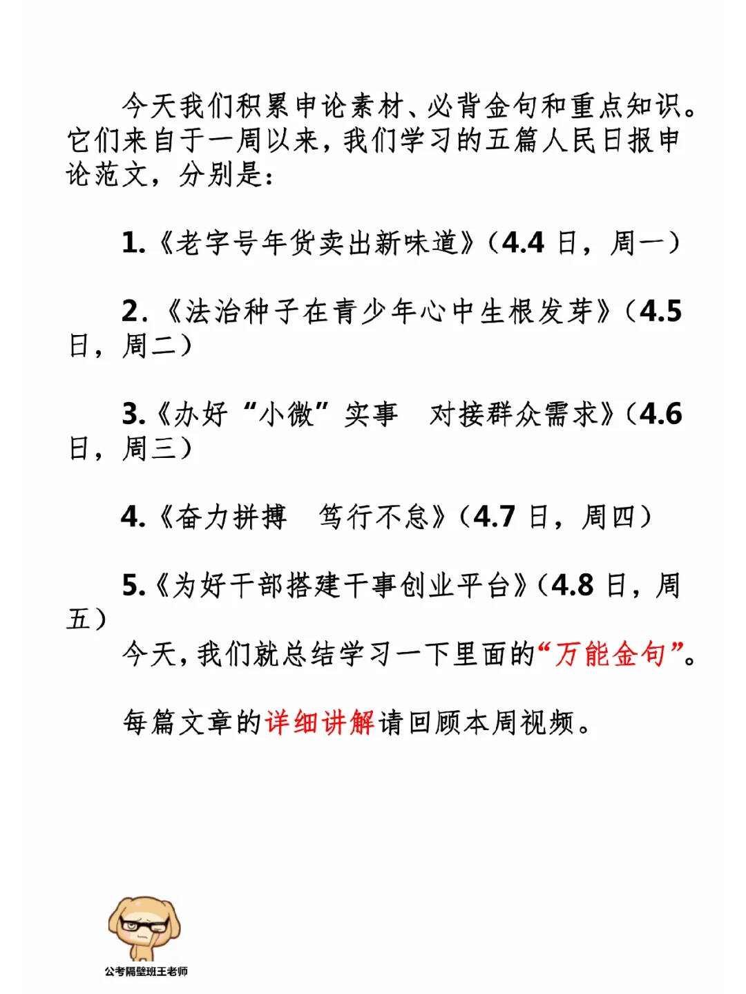 今天我们积累申论素材、必背金句和重点知识。它们来自于一周以来,我们学习的五篇人民日报申论范文,分别是: