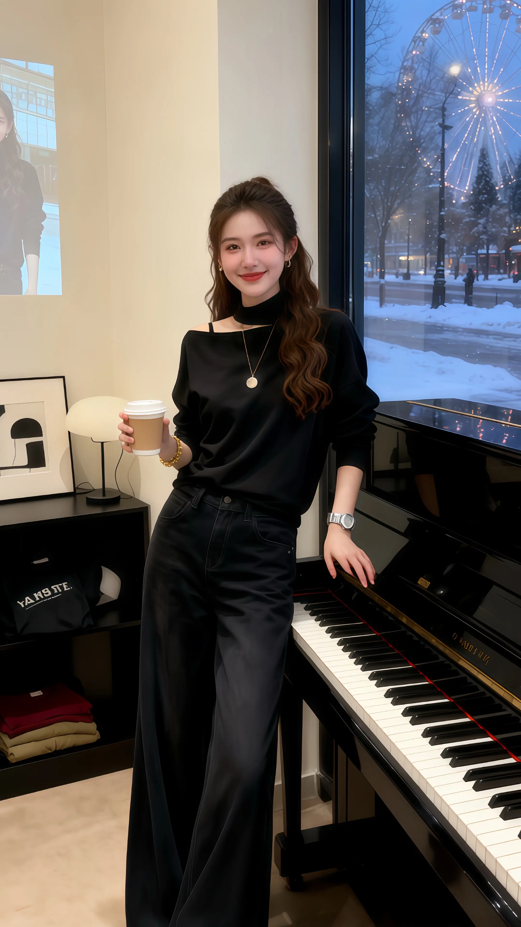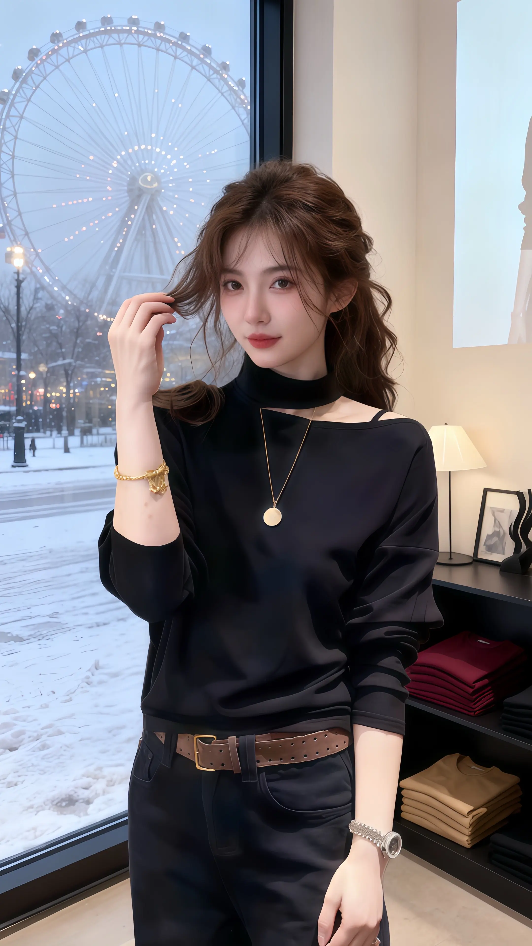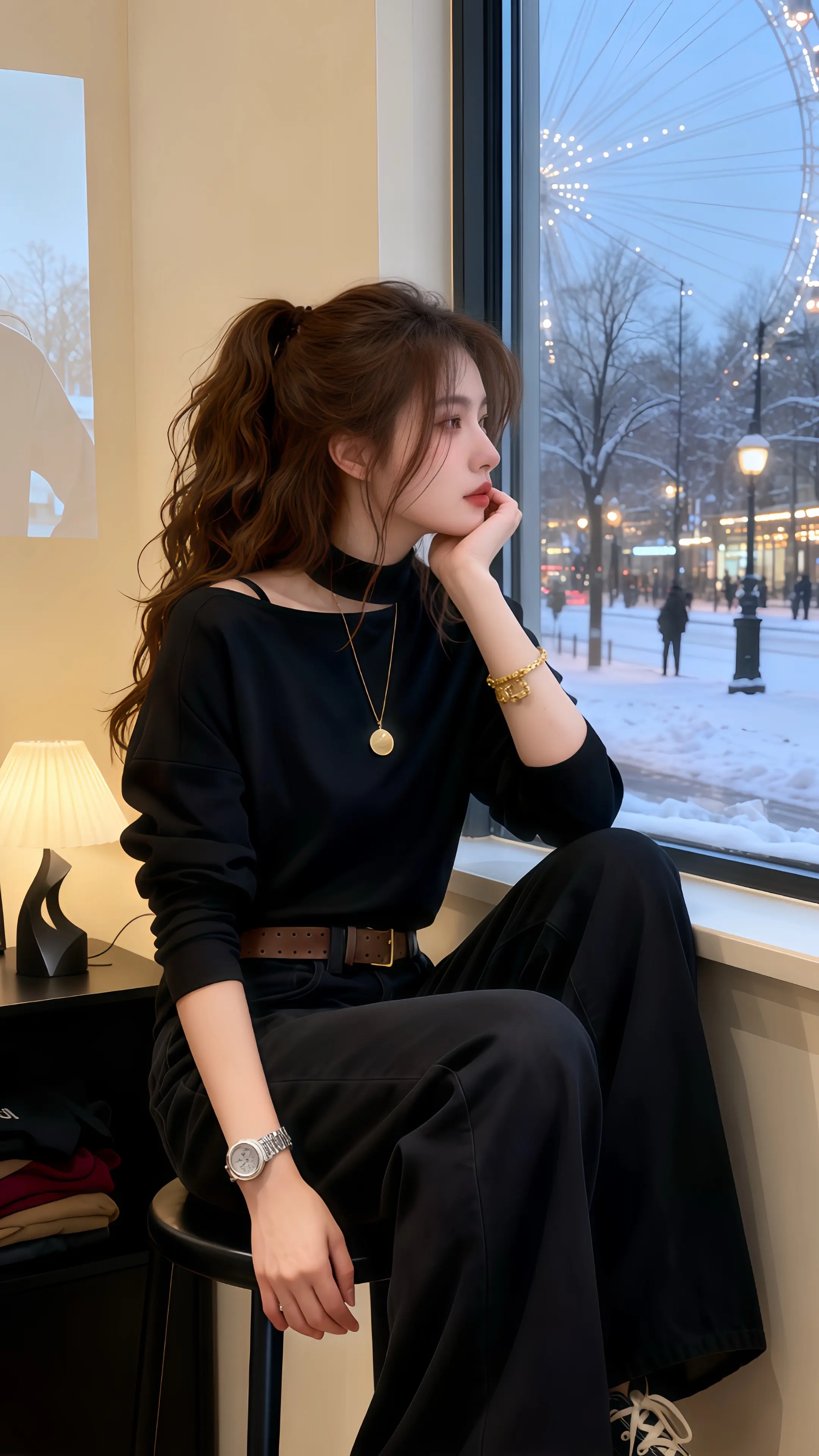 她穿着设计感时尚两件套,斜肩剪裁露肤恰到好处,勾勒出柔美肩颈线条,搭配垂坠感十足的阔腿牛仔裤,休闲帆布鞋增添随性格调,整套穿搭简约却满是巧思。临窗而坐,米色窗台承托着她的手肘,指尖轻托下颌,棕色波浪卷发随意束在脑后,额前碎发随呼吸微扬。窗外是白茫茫的冬季雪景,街道被薄雪覆盖,极远处的摩天轮缀着朦胧灯光,电影感拉满。室内黑色置物柜与艺术台灯相映,投影画布映出同款穿搭剪影,暖光漫过白皙面庞,明亮眼眸里盛着雪色与星光,气质清甜又带几分慵懒,定格成冬日里最治愈的时尚画卷。