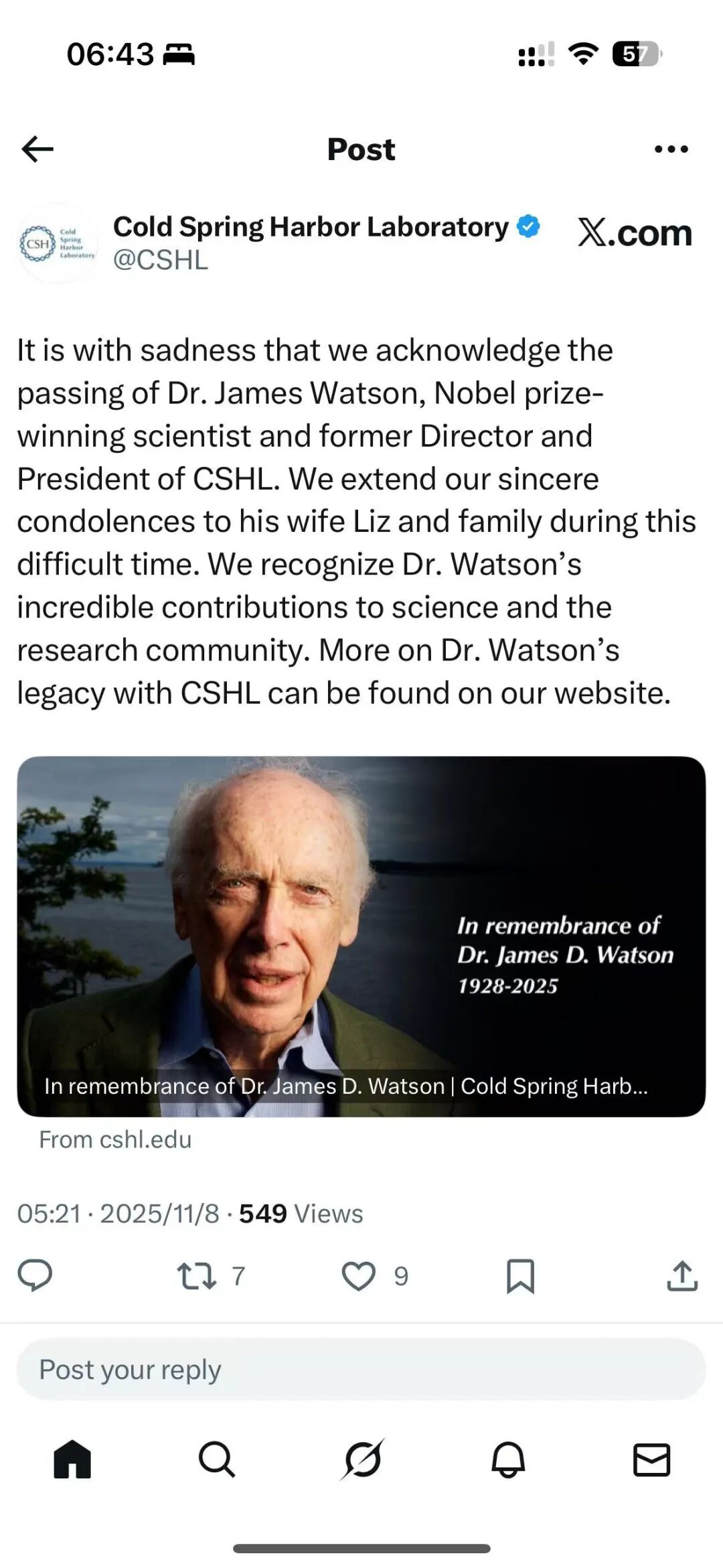 2025年11月6日,20世纪最重要的科学家之一、DNA双螺旋结构发现者、诺贝尔奖得主詹姆斯·沃森(JamesWatson)去世,他于一周前因感染接受治疗后转入临终关怀病房,享年97岁。作为深耕分子诊断领域的龙头企业,凯普生物对沃森博士的离世深感痛惜,并向这位开创分子生物学新纪元的科学先驱致以深切哀悼与崇高敬意。