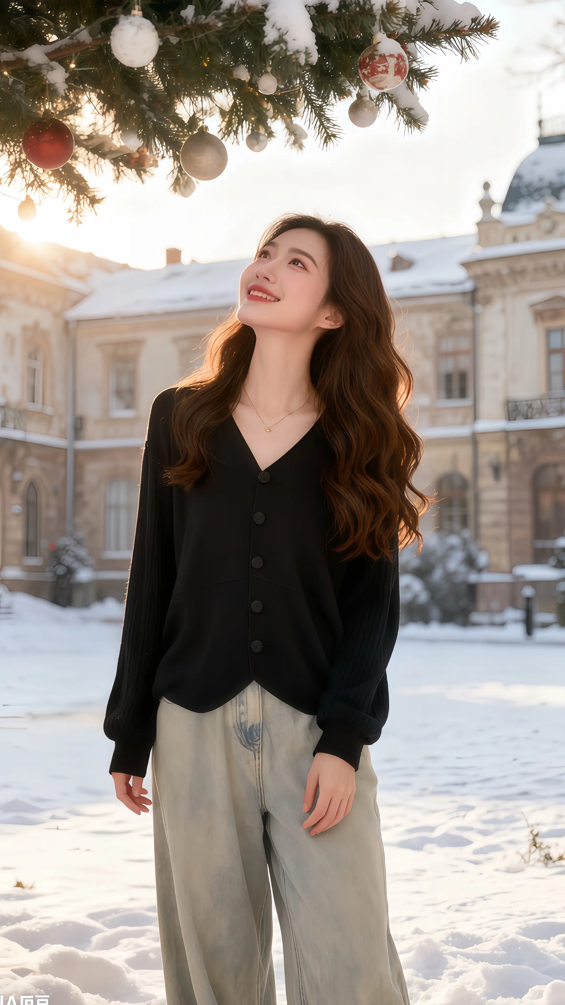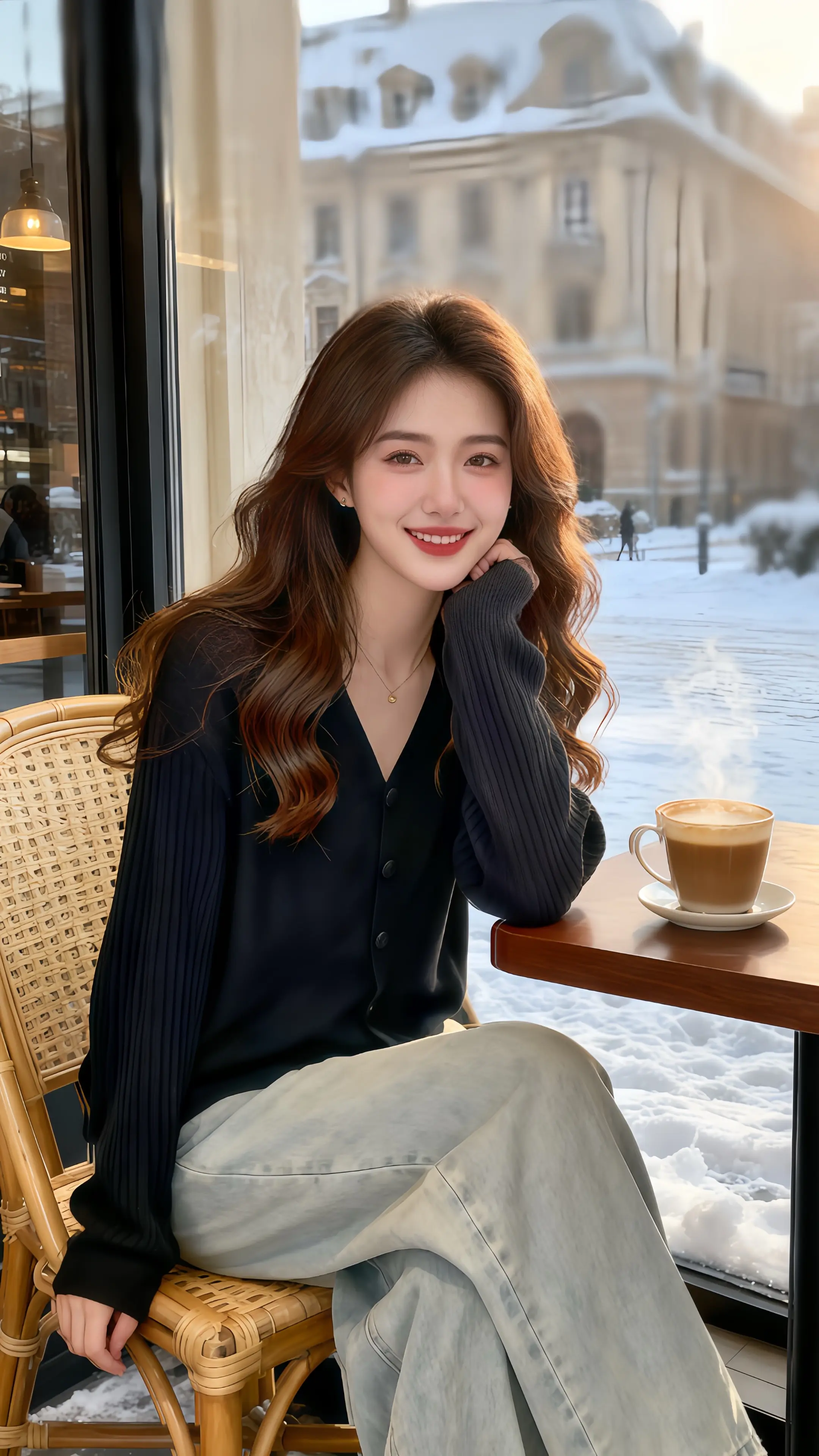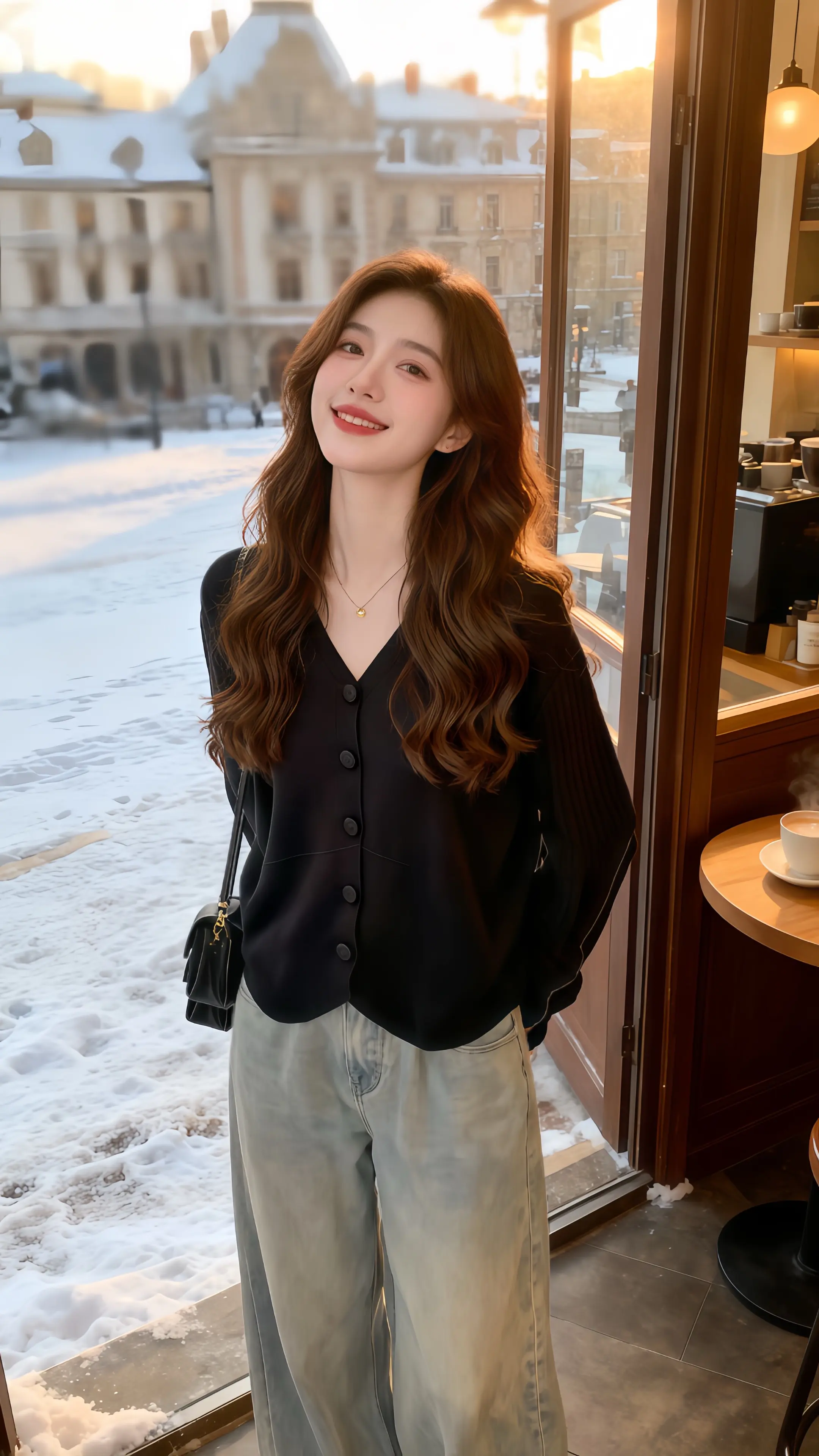 她穿着韩系大码针织开衫毛衣,软乎乎的黑色肌理裹住肩背,单侧纽扣松松扣着,坠着的复古牛仔裤漫出松弛的暖意。蜷在窗边绒毯上,指尖碰了碰咖啡杯沿的热气,窗外雪絮正吻过复古欧式建筑的尖顶,阳光揉碎在雪面上,晕出软绵的金。开衫的宽袖笼住半只手臂,发梢沾了点室内暖光的绒,她抬眼时,笑涡里裹着冬雪的静——一件针织衫的妥帖,是把窗外的冷、怀里的暖,都织进了不慌不忙的午后里。