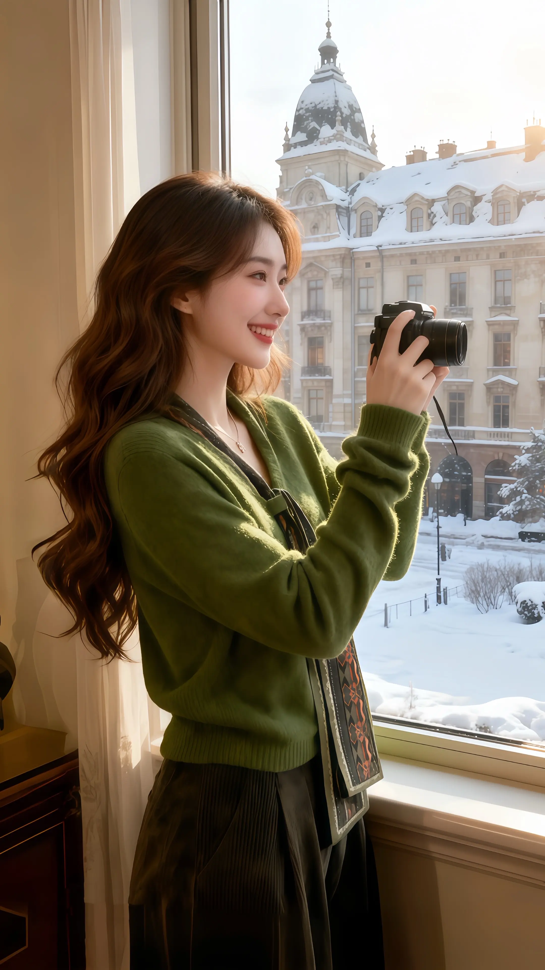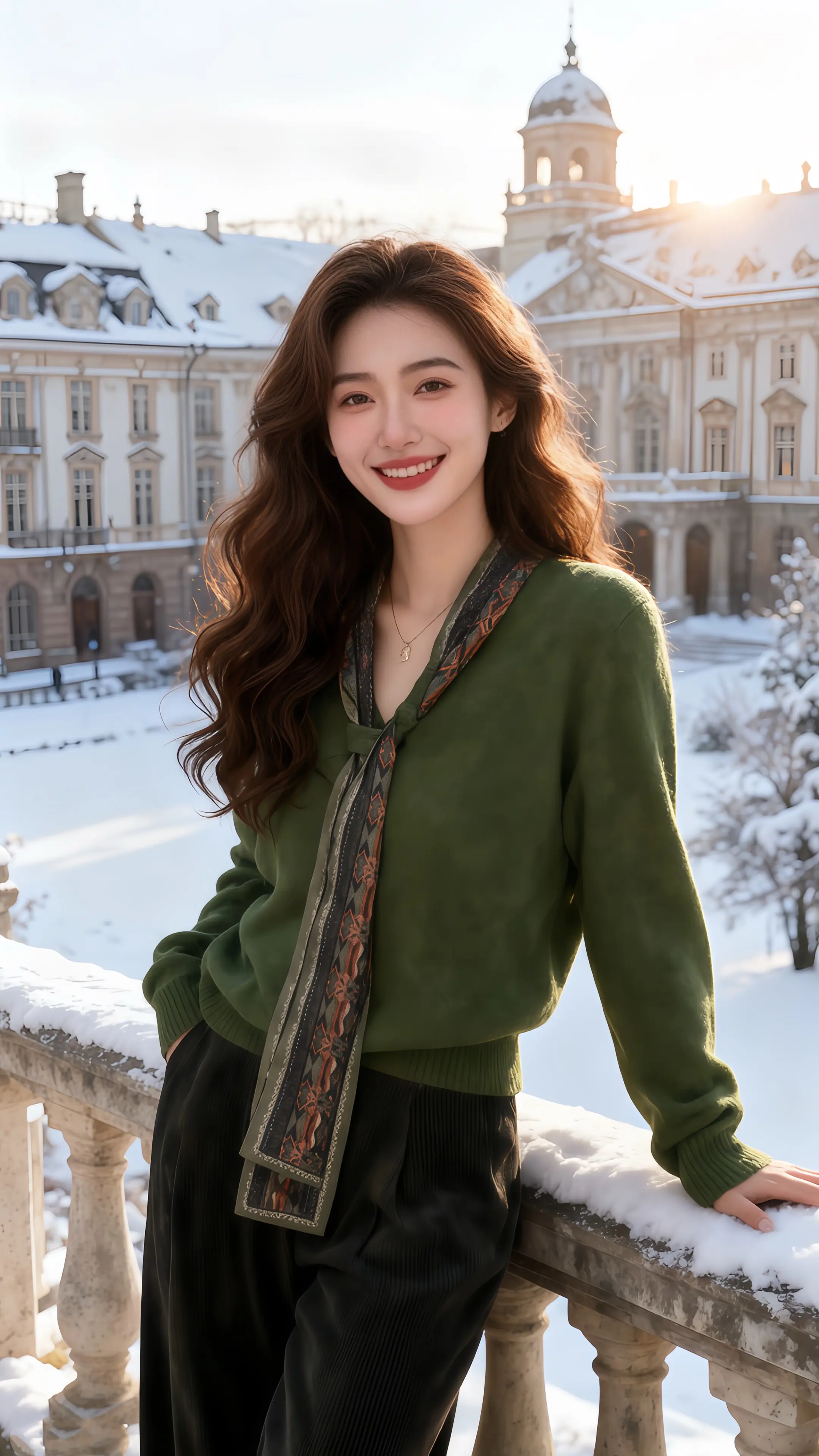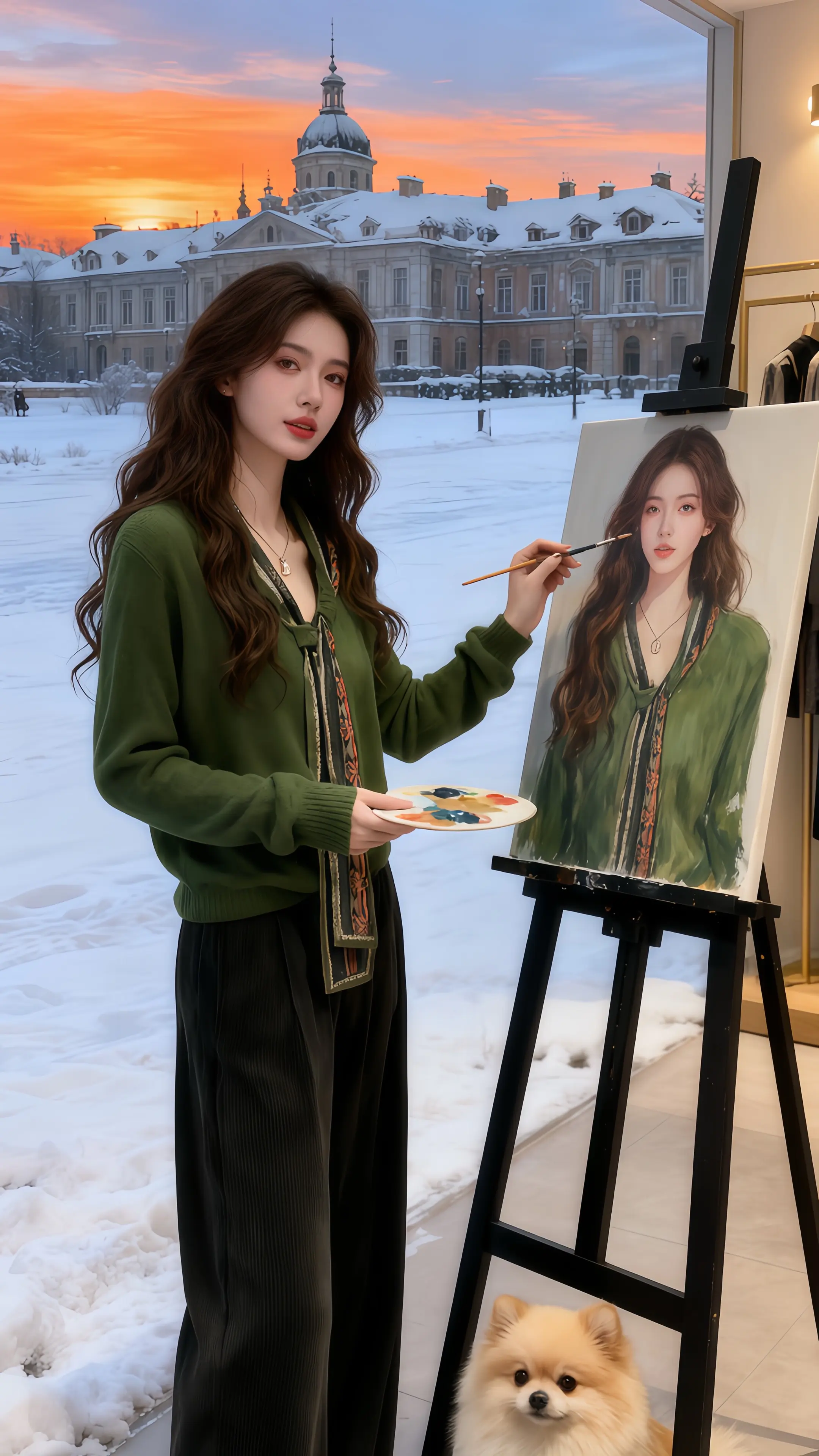 她穿着法式复古慵懒风毛衣,墨绿绒线裹着肩颈,飘带垂成软绵的弧度。指尖勾着热拿铁的杯沿,雾气漫上玻璃窗,晕开外面落雪的欧式屋顶。暖灯揉软她的大波浪发尾,连呼吸都浸着松弛——雪片黏在窗沿,远处尖顶覆了层糖霜,晚霞把天织成橙蓝撞色的软绒。她偏头笑时,毛衣沾了点咖啡香,脚边蜷着的博美晃了晃尾巴,把这冬夜的慵懒,锁进了针脚里。