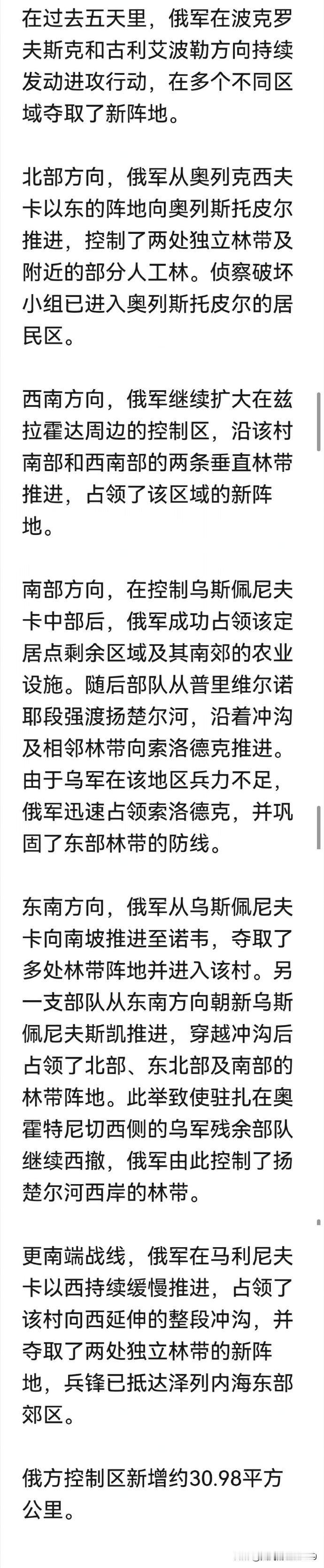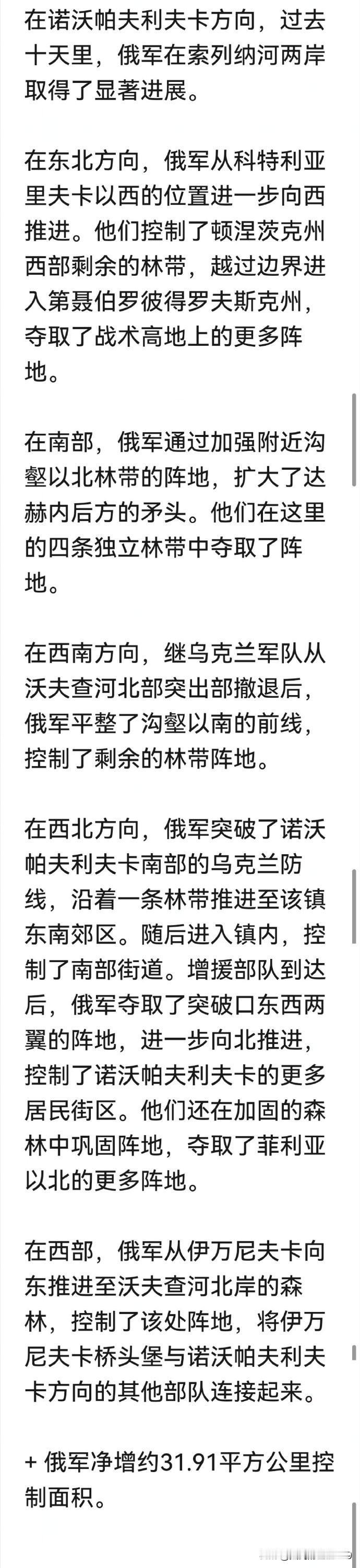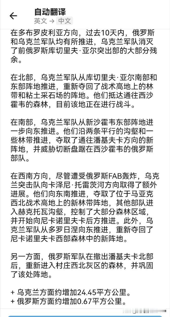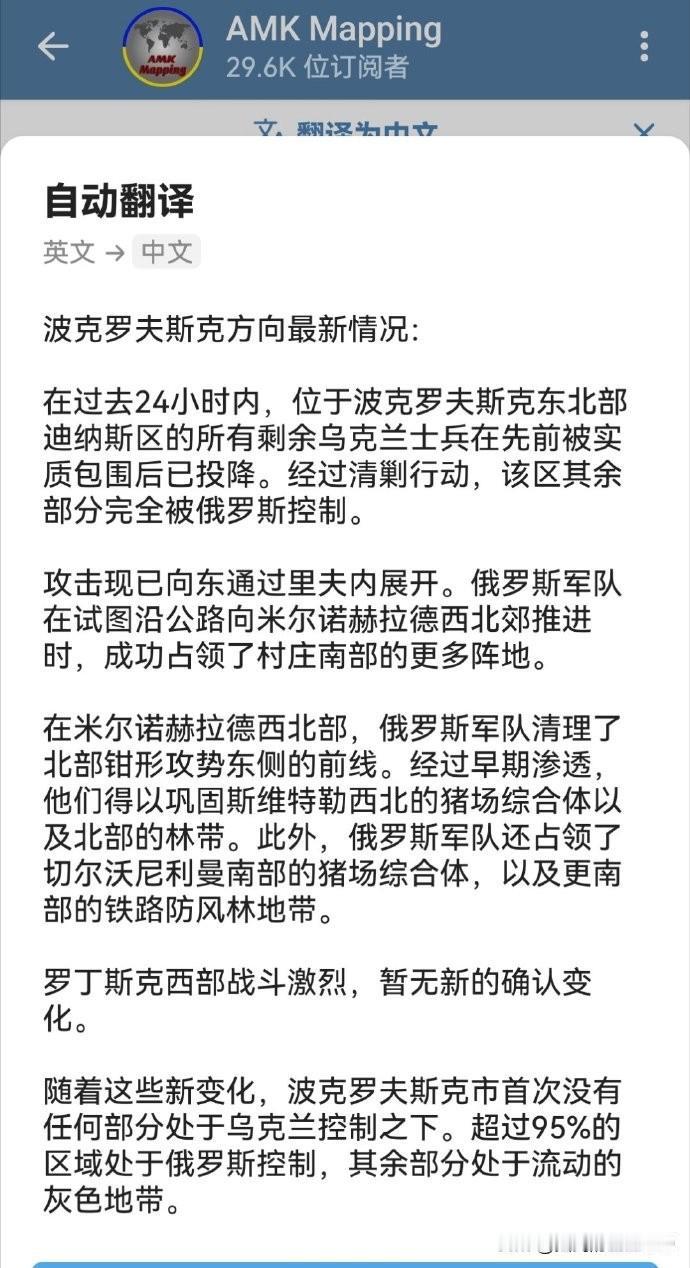 俄乌局势过去24小时情况汇总。乌军中了俄军“调虎离山,声东击西”之计。 很显然,俄军在多布罗皮利亚地区此前的大踏步渗透行动,成功吸引了乌军多支主力精锐部队。 随后,趁机在波克罗夫斯克方向,第聂伯罗方向发动攻势,成功玩了一出“调虎离山,声东击西” 虽然乌军在多布罗皮利亚地区获得进展,夺回了一些领土,但却在主要的波克罗夫斯克方向,第聂伯罗方向失去了更多的领土。 截止到目前,根据AKM对乌克兰东部,东南部局势的报道,俄军已占领了 波克罗夫斯克 95%的区域。在第聂伯罗彼得罗夫斯克州等地仍在不断推进。 而乌军似乎已经无力在多条战线阻挡俄军的推进,仅在多布罗皮利亚地区有少许进展。