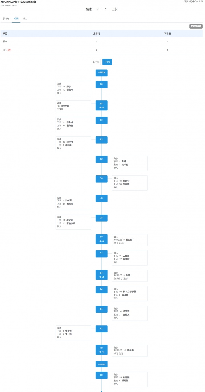全运男足U20-山东4-0福建晋级4强将战湖北 路俊伟彭啸杜月徵破门