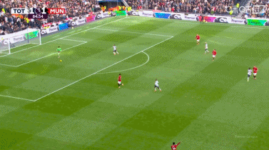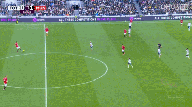 第70分钟,阿玛德中场送出斜长传,B费单刀球胸部停球后顺势一脚挑射,打偏了。↓