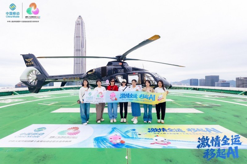 2025年11月7日,中国首个A类高架机场——深圳大中华直升机场内,两架次印有“激情全运,移起AI”及全运会元素的直升机腾空而起,将十五运的激情活力传遍湾区。